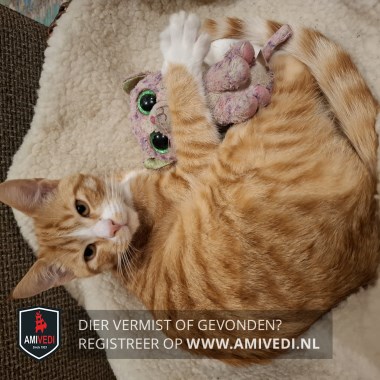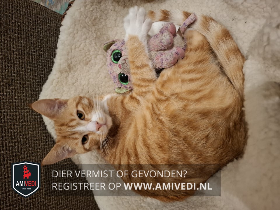 | Signalement | Slanke kater, groot voor zijn leeftijd, spitse snoet met witte bef en licht rood vlekje onder de neus. Witte voetjes en buik. Verder cypers rood gestreept en een met wit geringde staart. Lichtbruine ogen. |