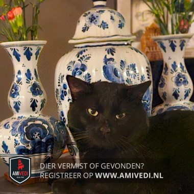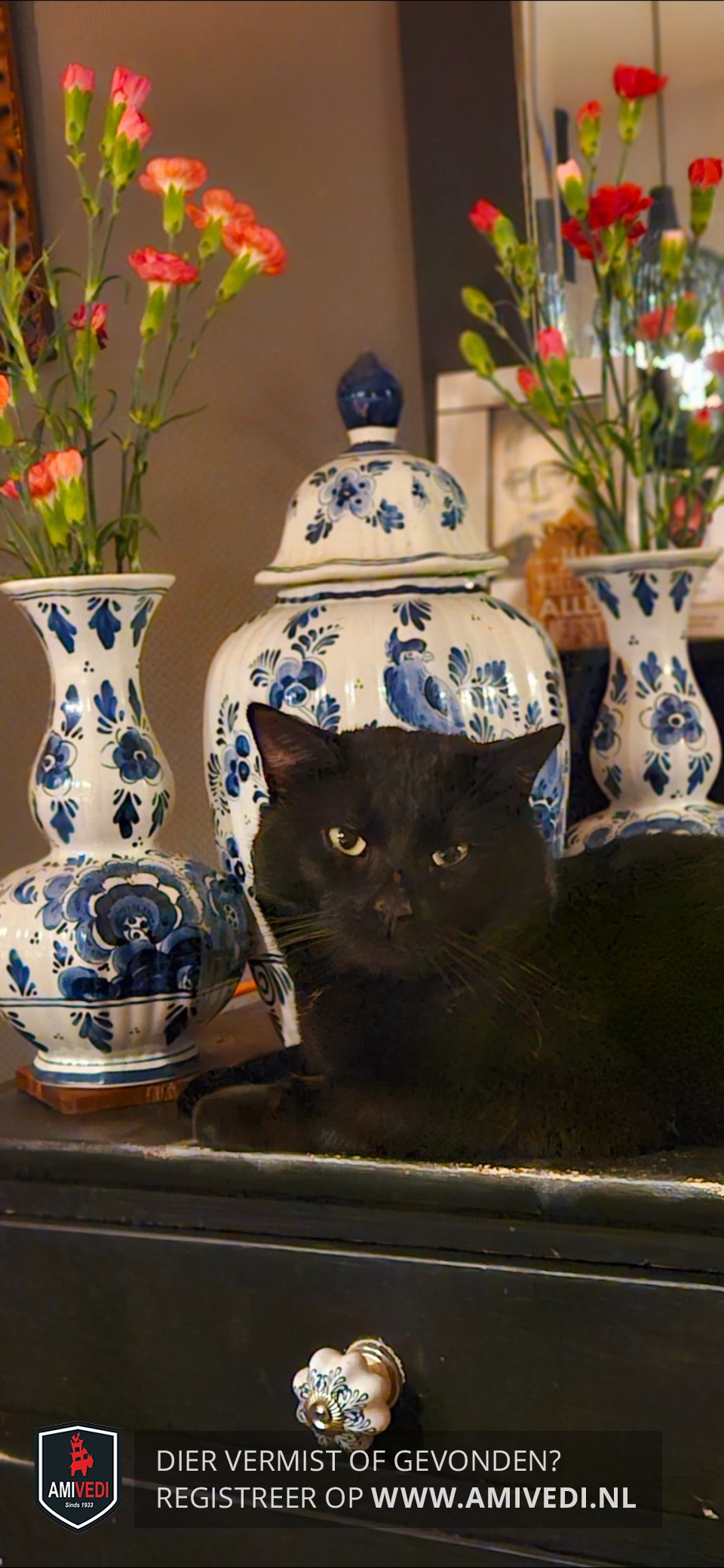 | Signalement | Zwarte kater met enkele zwarte haren op de borst. Aanhankelijk. |