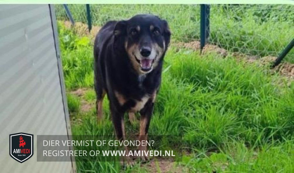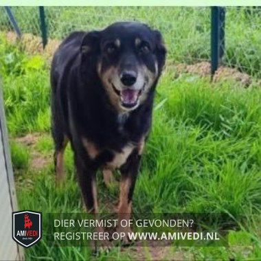| Signalement | Zwarte kop en lijf. Bruin rond neus en bek. Bruine poten. Schuchtere hond uit buitendlands dierenasiel. Zal niet naar je toekomen bij het roepen. |