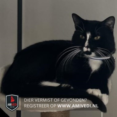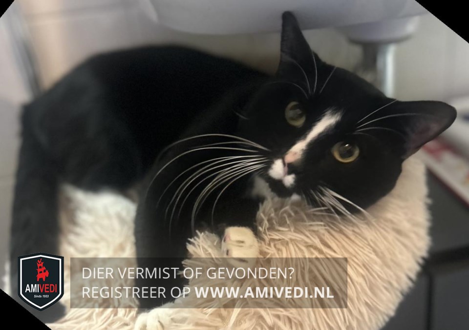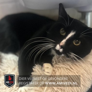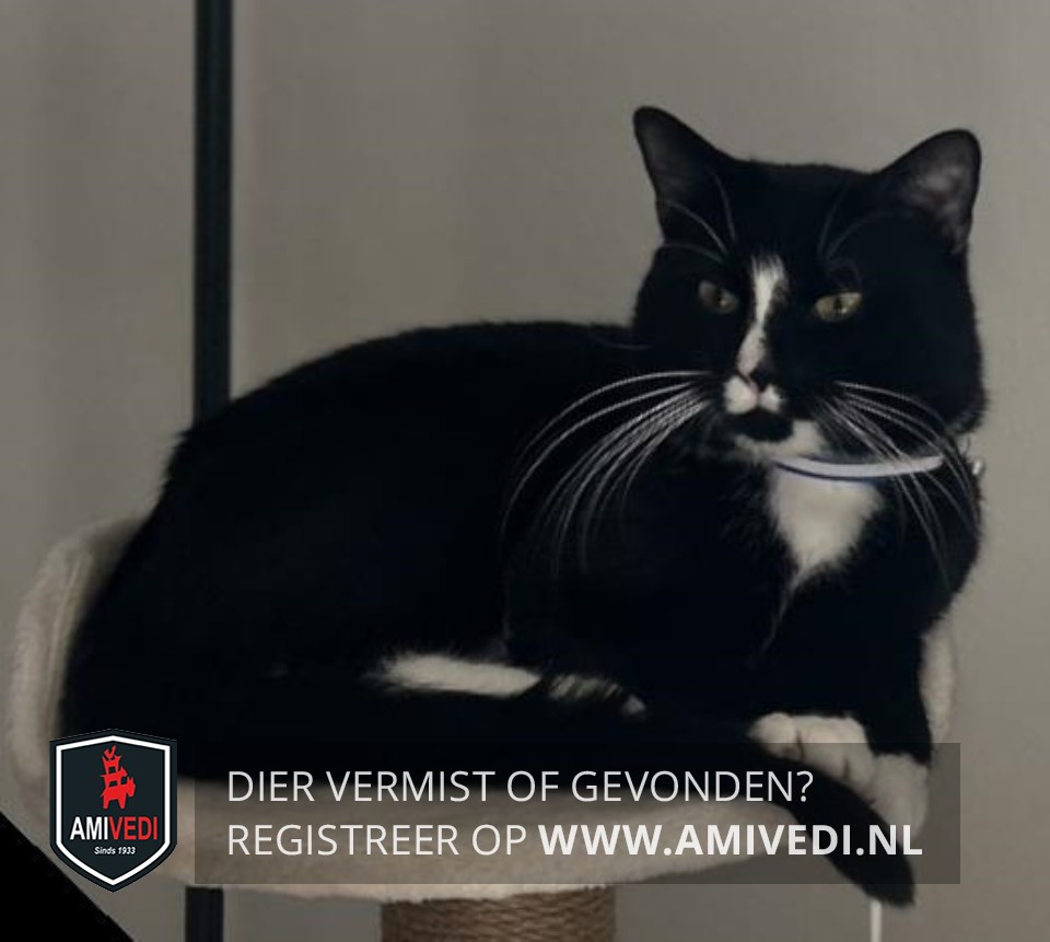 | Signalement | Zwart wit Witte lijn vanaf het voorhoofd over en tot het einde van de neusbrug, op de neusspiegel een roze vertikaal streepje rechts op de neus, wit snorretje, zwarte kin, witte vlek op de borst, witte voetjes voor, witte buik, witte sokjes achter. |