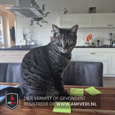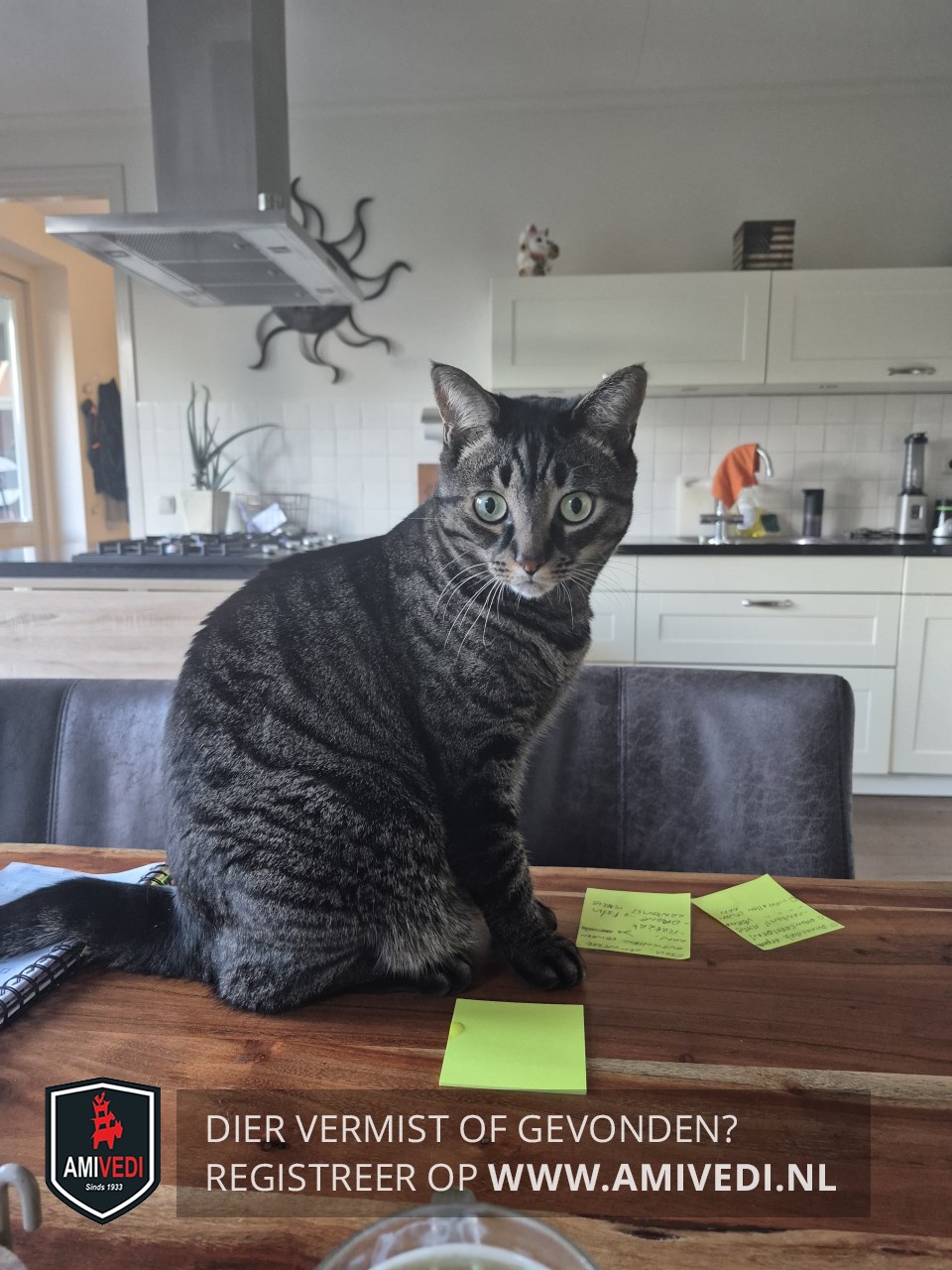 | Signalement | Cypers zwart-grijs gestreepte kater met opvallend grote groene ogen. |