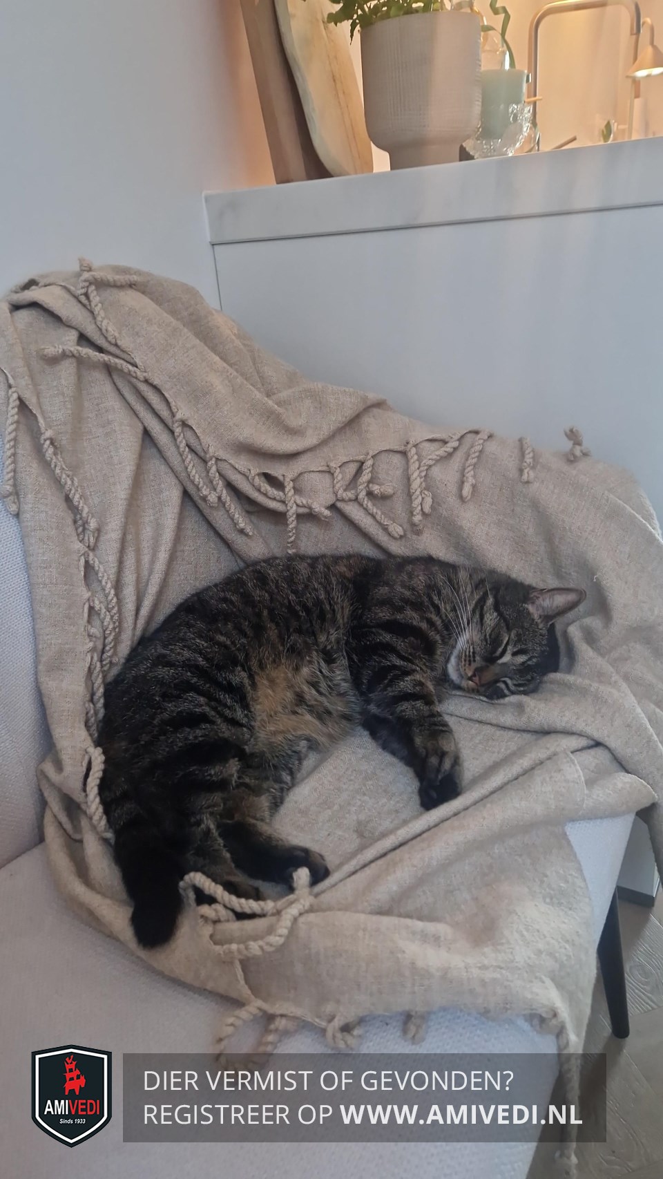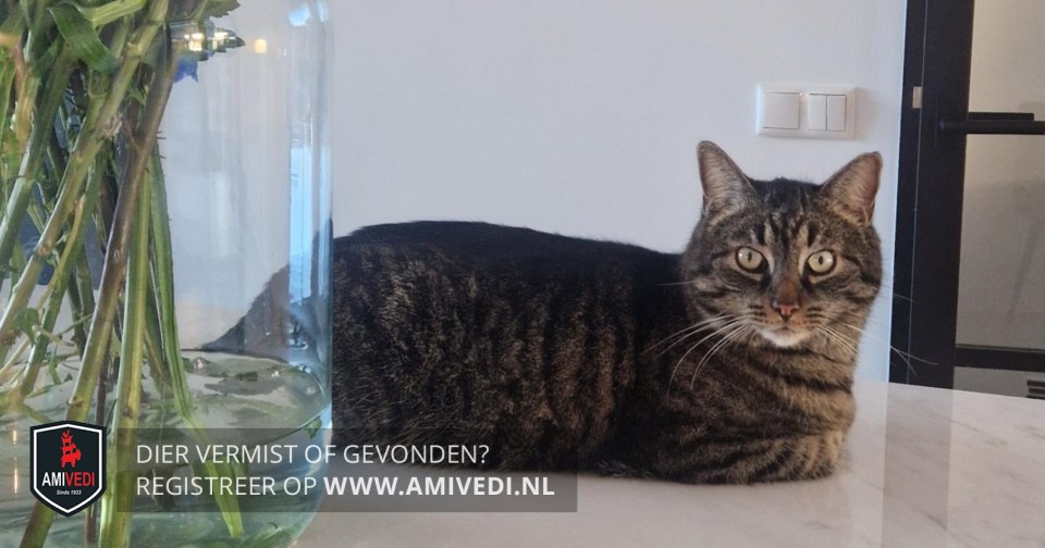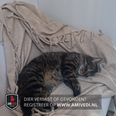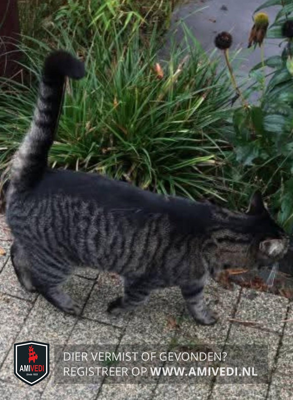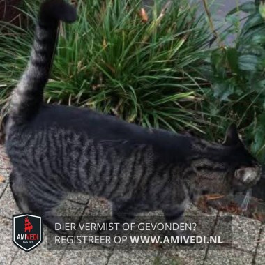 | Signalement | Europese korthaar grijs/bruin met zwart gestreept en wit. Bovenkant kopje zwart, over de rug een zwarte streep. Heeft een witte kin en bruin op het buikje. Staart zwart met aan onderkant half grijs gestreepte ringen eindigen in zwarte punt. |