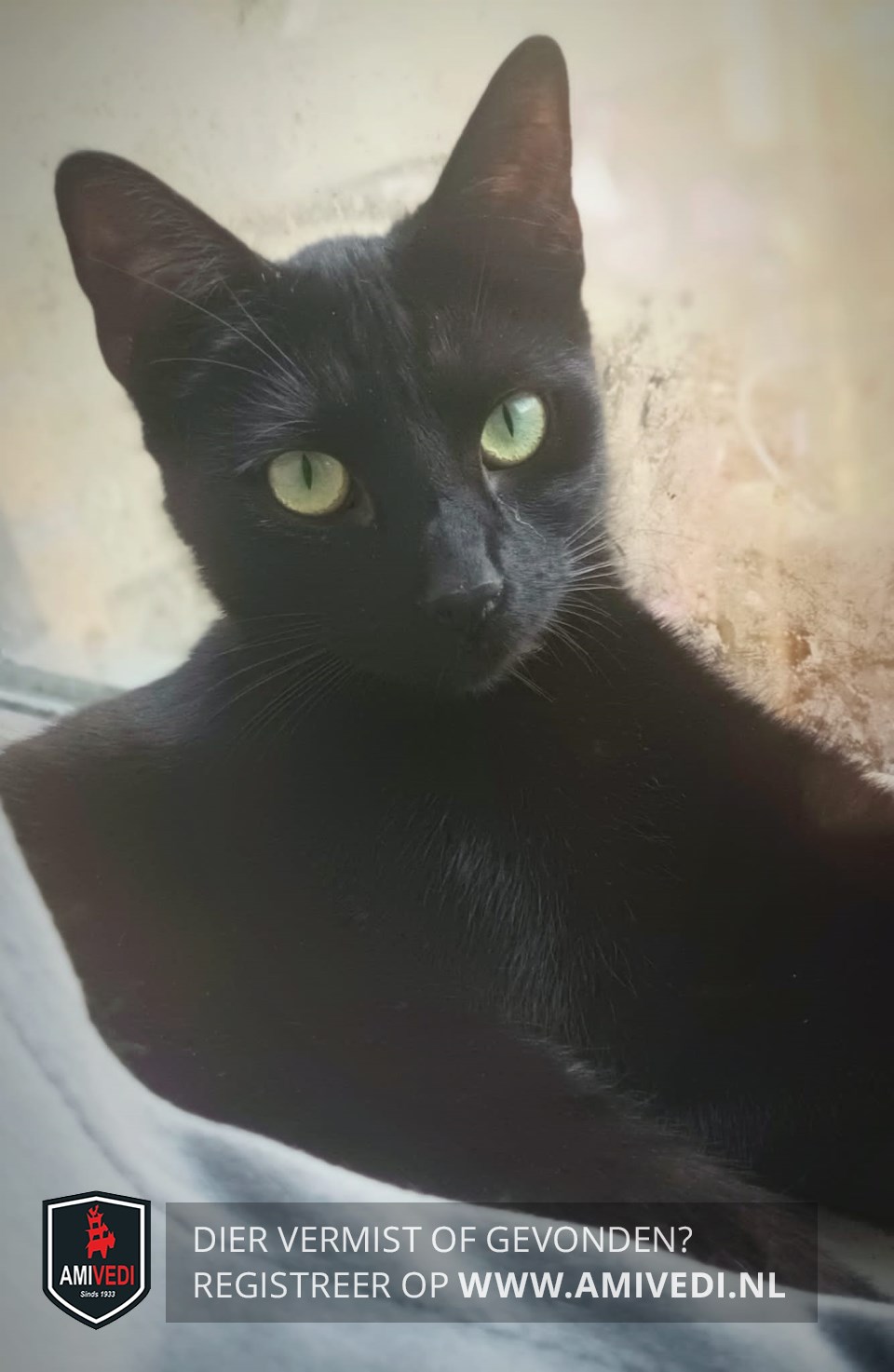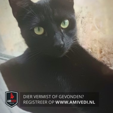 | Signalement | Pikzwart, slank en witte buik, groene ogen. |