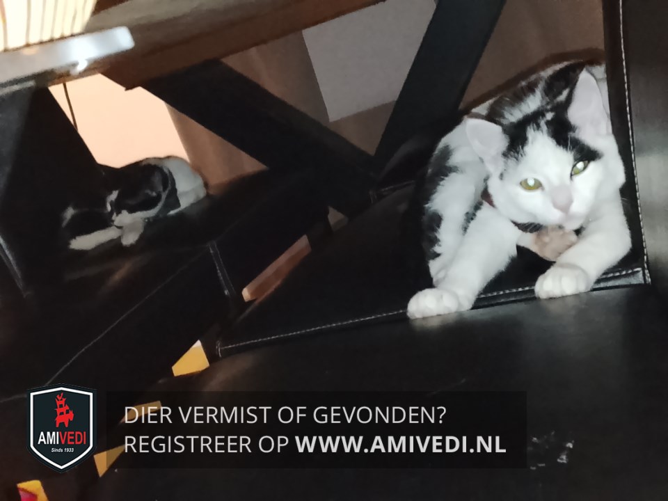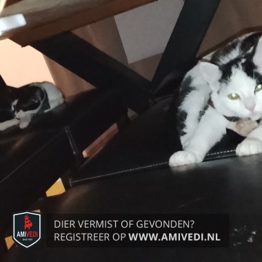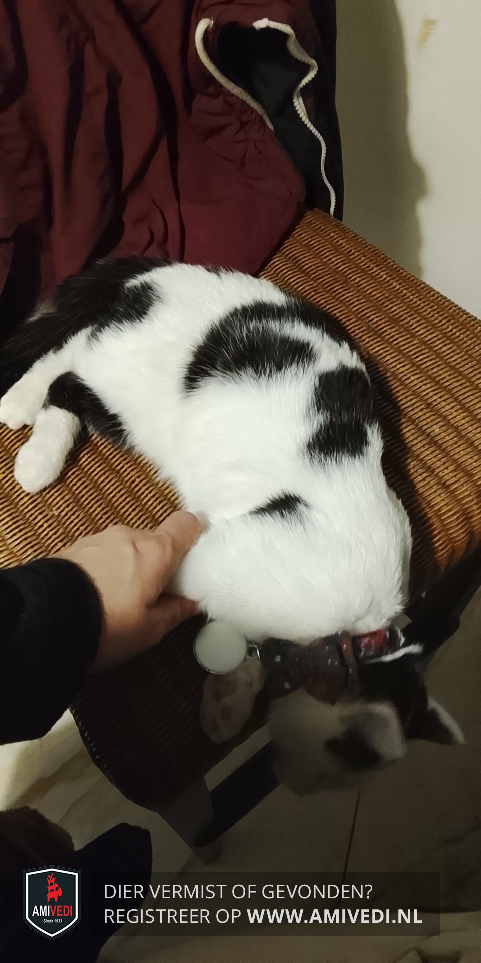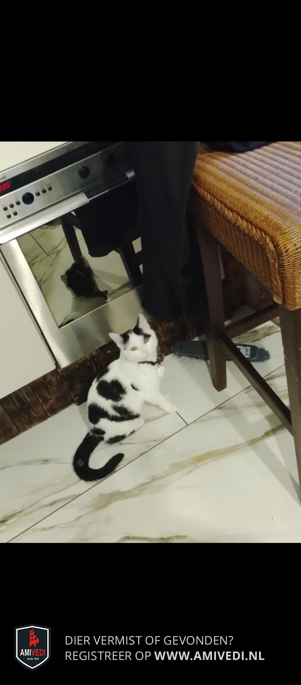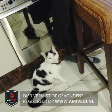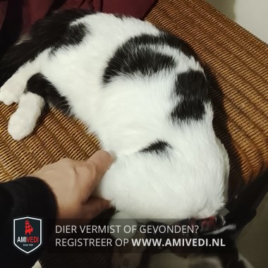 | Signalement | Wit met zwarte vlekken op lijf en zwarte staart, zwarte vlek aan de rechterkant van de mond. |