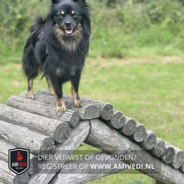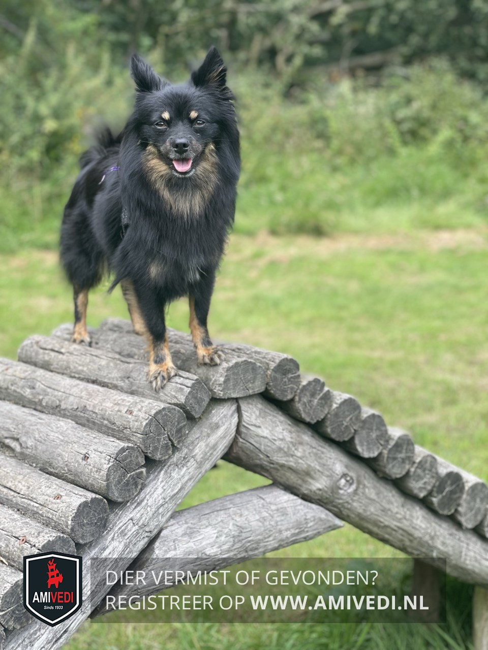 | Signalement | Keeshond Black/tan (bruine stippen boven ogen, bruine keel/bef en bruine pootjes). |