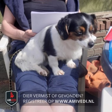 | Signalement | Zwarte oren en bovenkant hoofd. Witte streep op voorhoofd doorlopend naar snoet Witte snoet. Zwarte vlek op rechterschouder. Pas geleden pups gehad. |