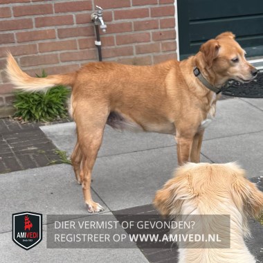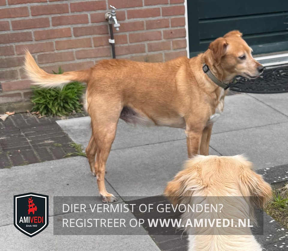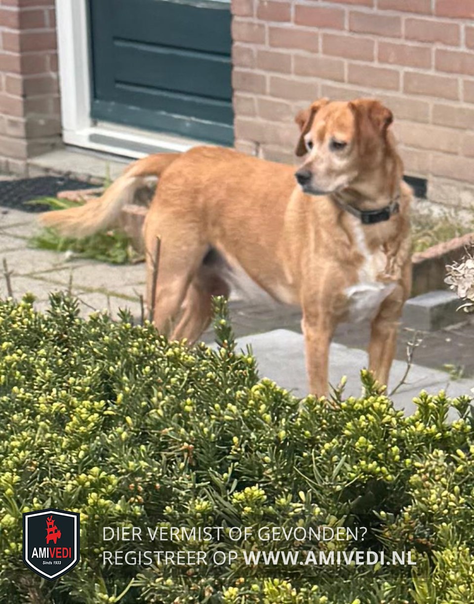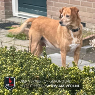 | Signalement | Blonde kruising met wit Grijzige snoet, witte vlek op de borst en witte teentjes rechts achter (andere pootjes niet goed in zicht). |