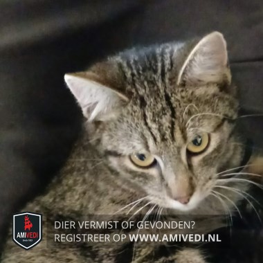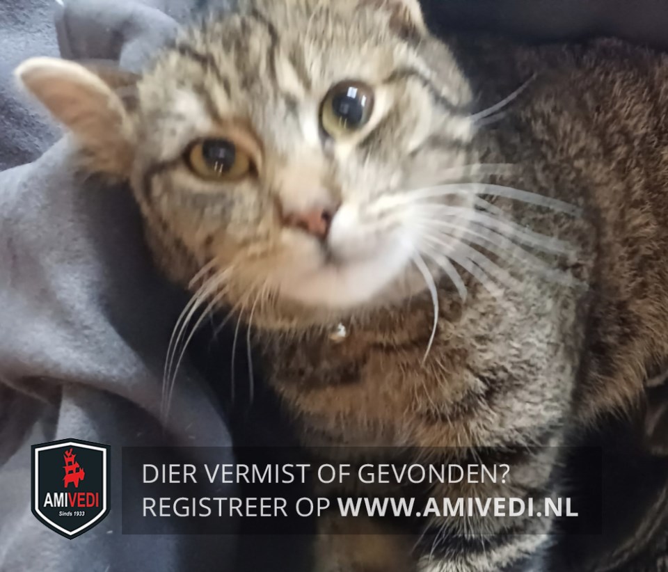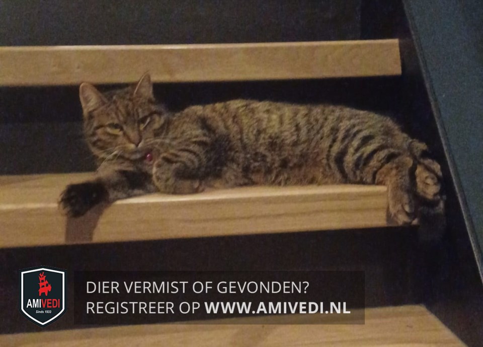 | Signalement | Cypers bruin met zwart gestreept. Roze bandje met belletje. |