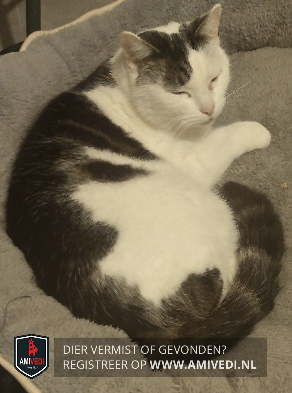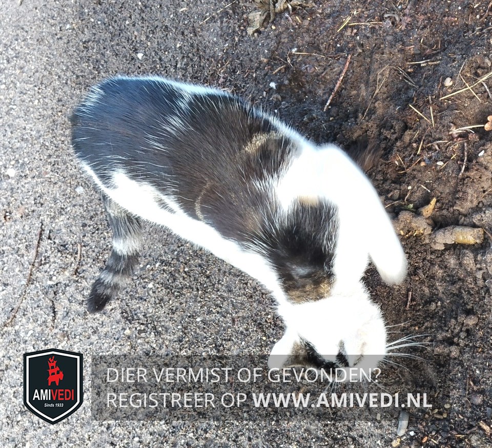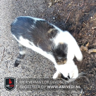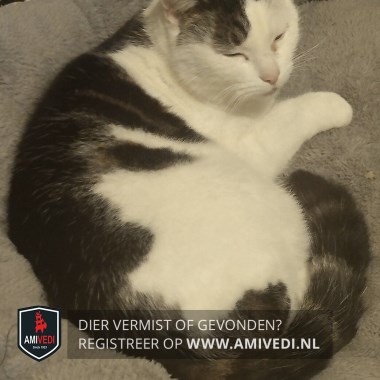 | Signalement | Kopje is meer wit met een grijze vlek bij rechteroor, rug grijg/bruine vlekken, staart grijs wit gestreept, pootjes wit. |