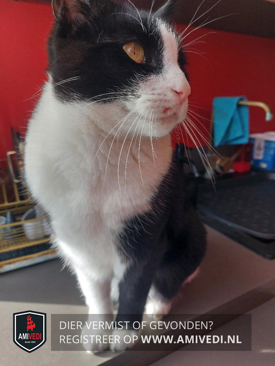 | Signalement | Zwart bovenop de kop tot onder de ogen, rug en flanken en staart. Witte neusbrug, snoet, kin, hals, bef, borst, buik. Aan de linkervoorpoot een wit voetje, rechtervoorpoot wit tot bovenaan, witte laarzen aan de achterpoten |