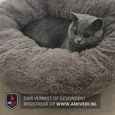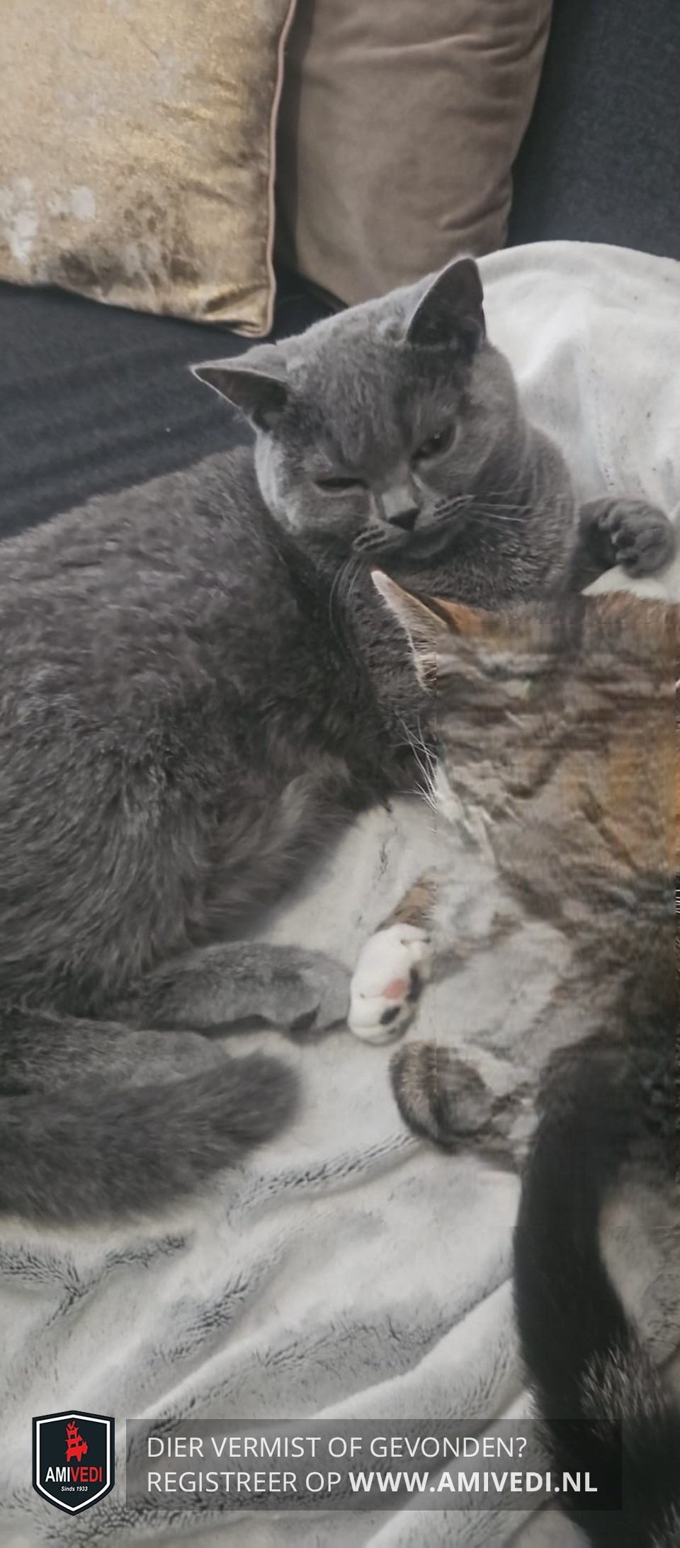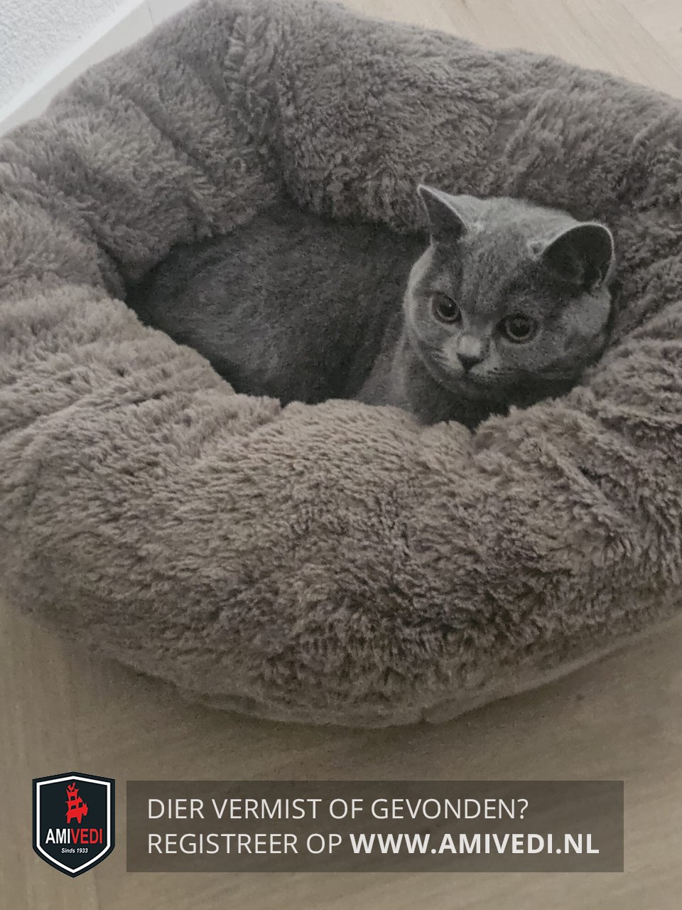 | Signalement | Britse korthaar poes, volledig grijs. |