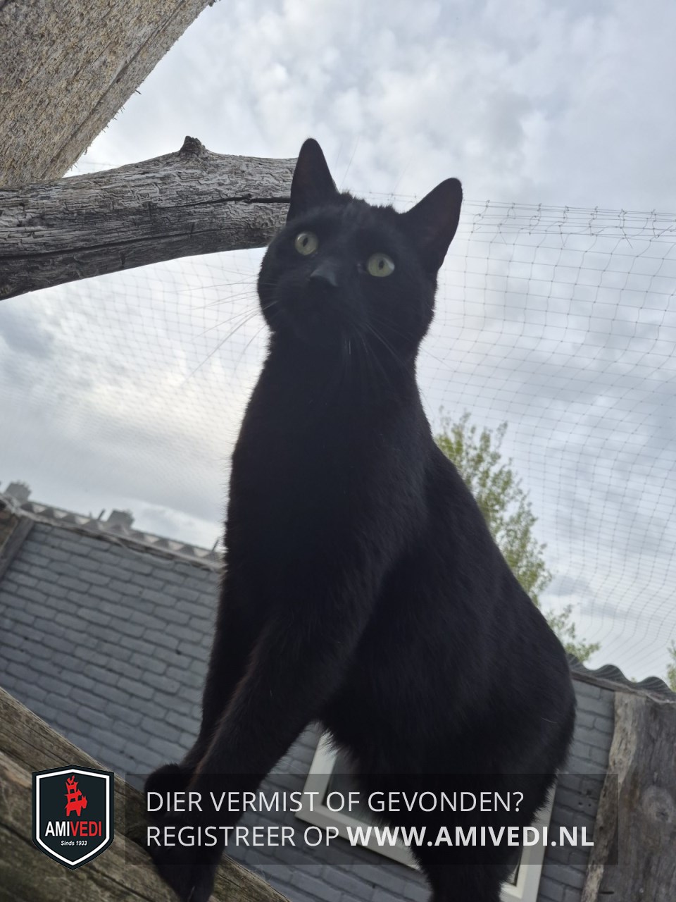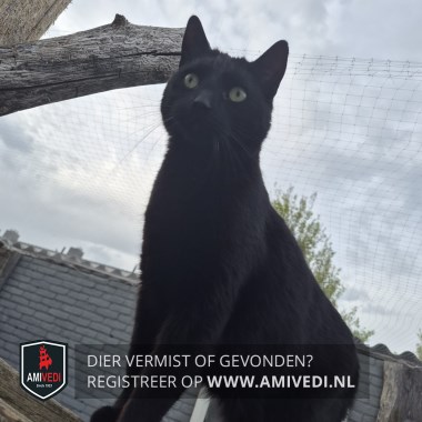 | Signalement | Zwart, paar witte haartjes op rechter schouderblad. |