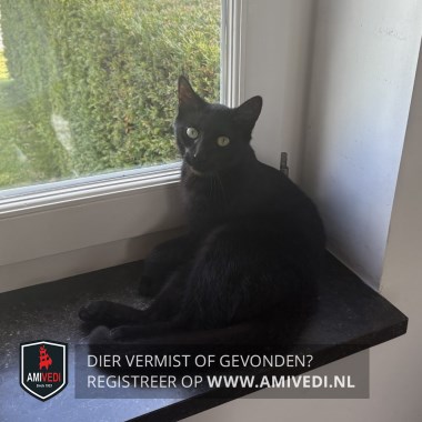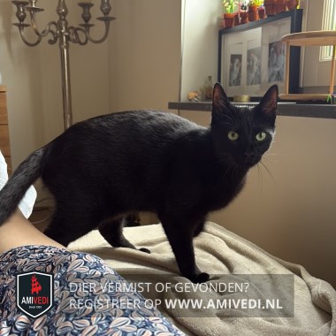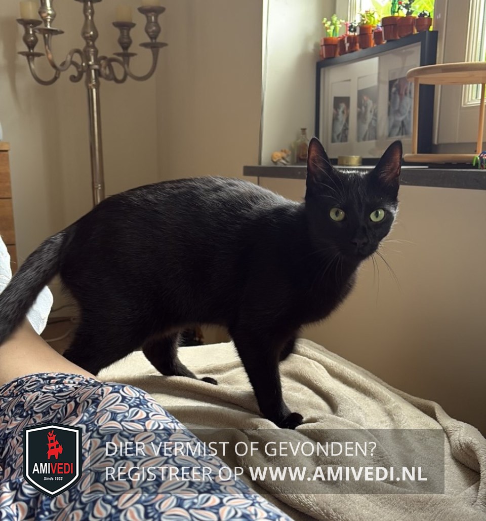 | Signalement | Volledige zwart. Loopt een klein beetje mank door een een eerdere botbreuk in haar achterpoot. |