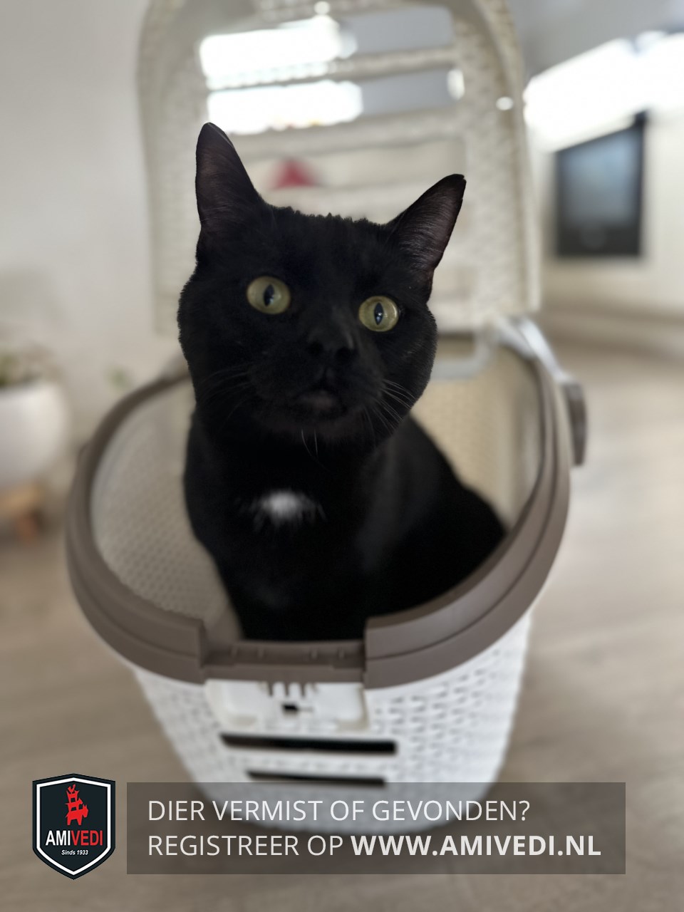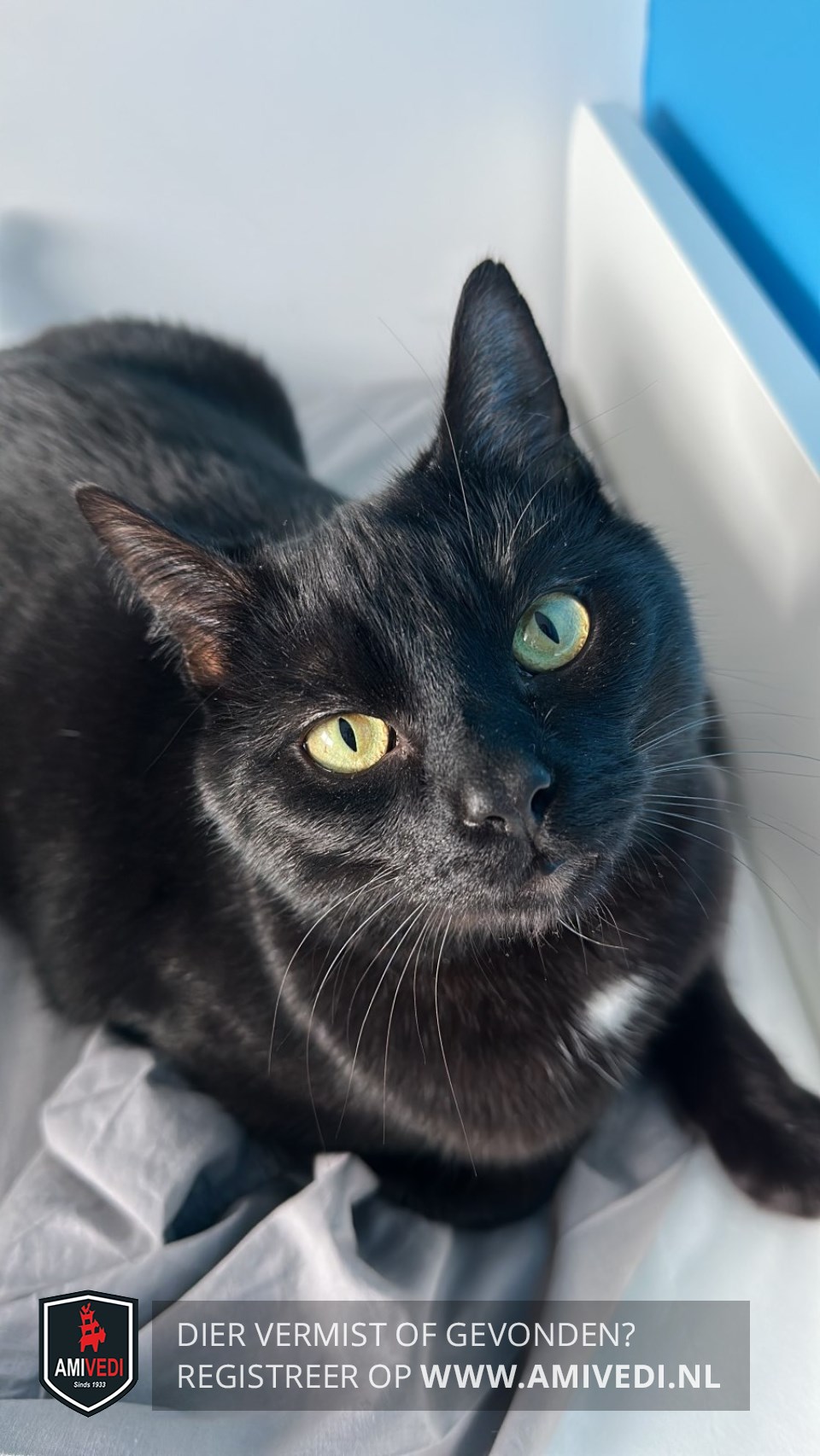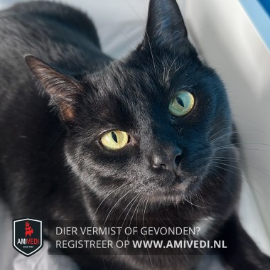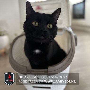 | Signalement | Egaal zwarte kater met een wit vlekje op de borst. |
