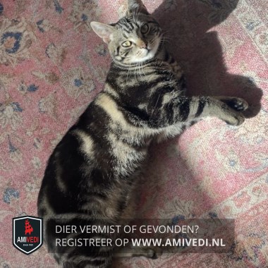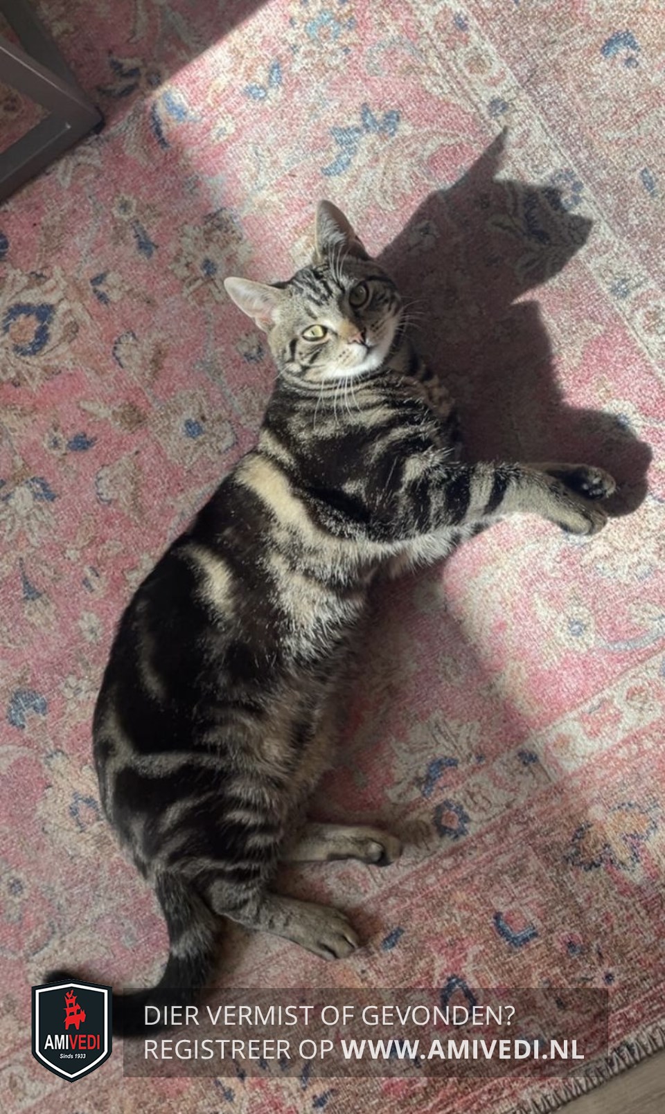 | Signalement | Cypers grijs/bruin/ zwart gemarmerd. Iets wit onder de neus en witte kin. Groene ogen. |
