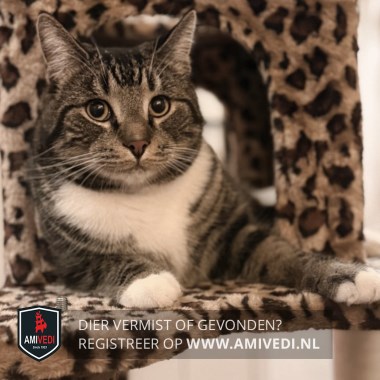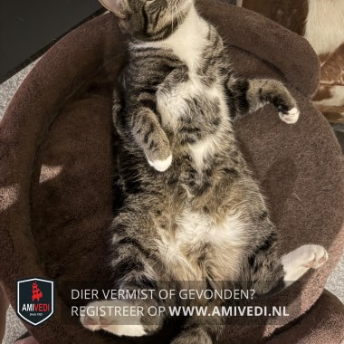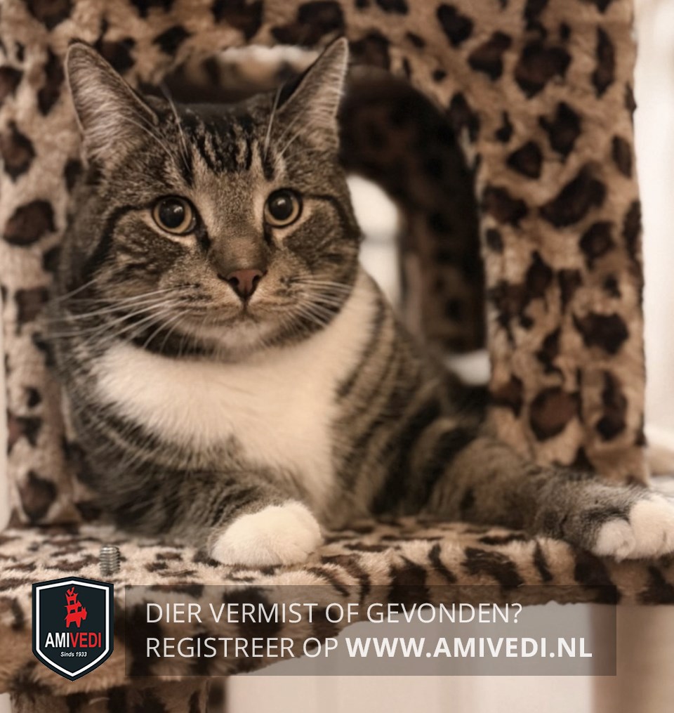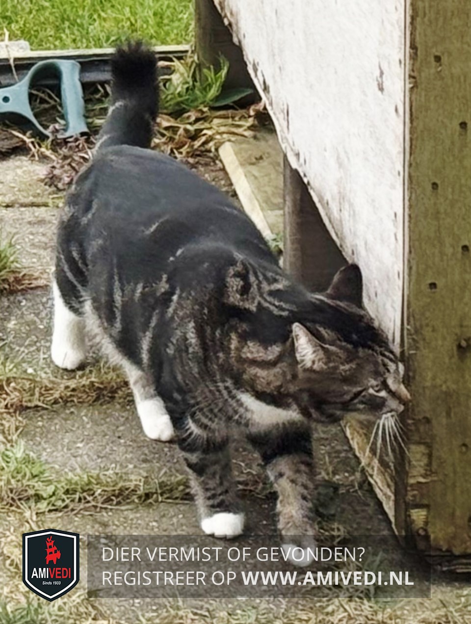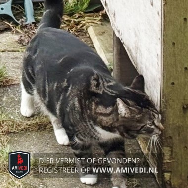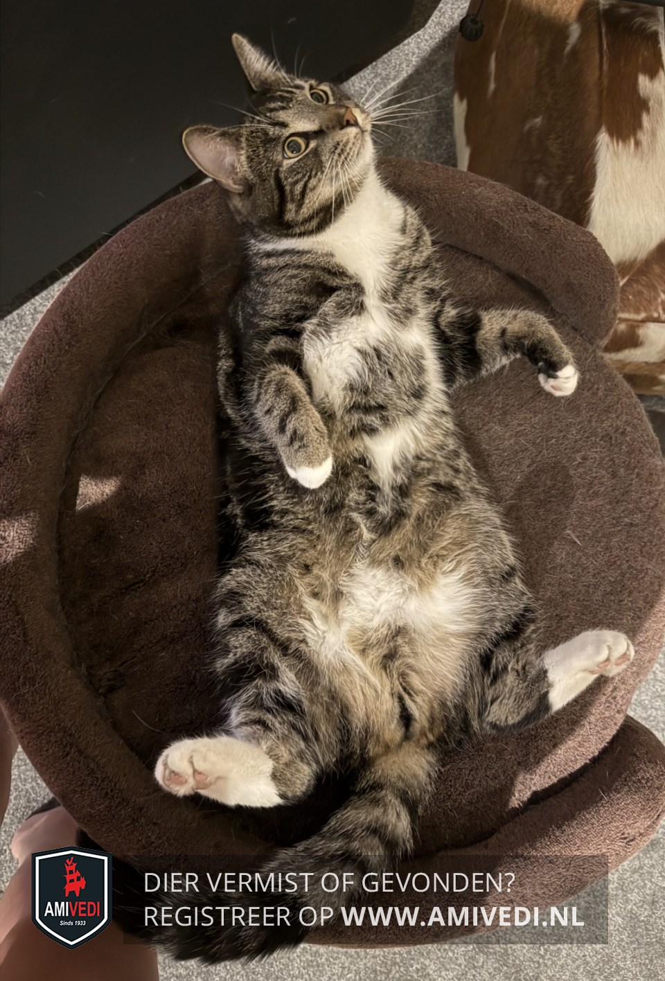 | Signalement | Cypers bruin-zwart gemarmerd met wit. Forse kater. Witte bef. Voor witte tenen, achter witte sokjes. Wit tussen de voorpoten met cypers rondje binnenin. Witte streep tussen de achterpoten. |