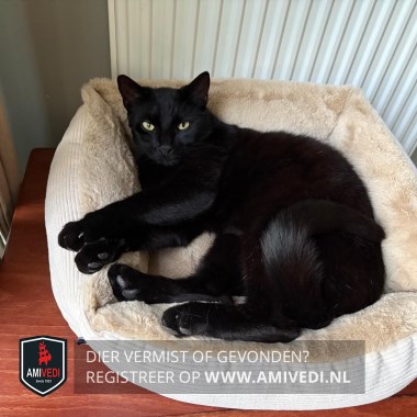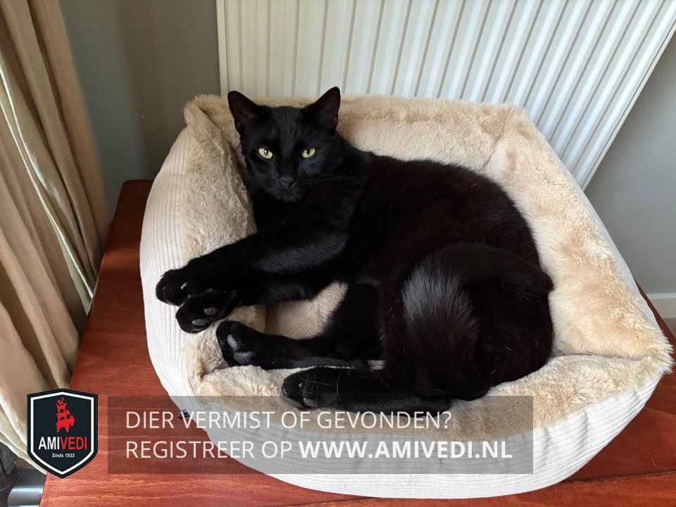 | Signalement | Volledig zwart. Hij heeft een wat kale huid aan het begin van zijn staart bij de kont. |
