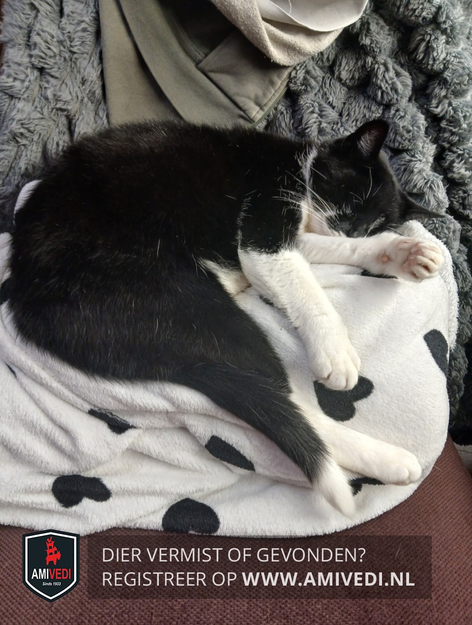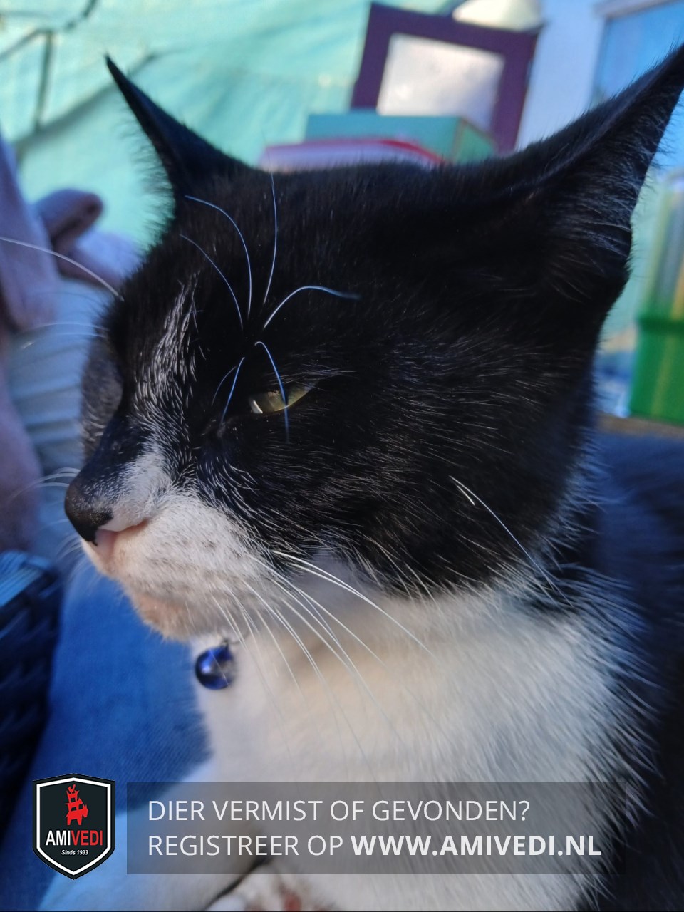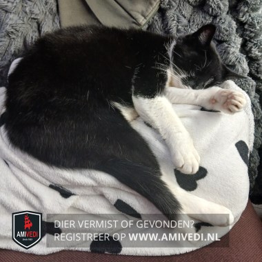 | Signalement | Wit met zwarte poes , witte achterpootjes, wit einde aan haar staart, zwart neusje met een gedeeltelijke roze onderkant, witte haartjes op haar neusje dat over het zwarte heen valt. Roze en zwarte kussentjes gemixt, zwarte rug en een zwarte staart met een witte punt. |