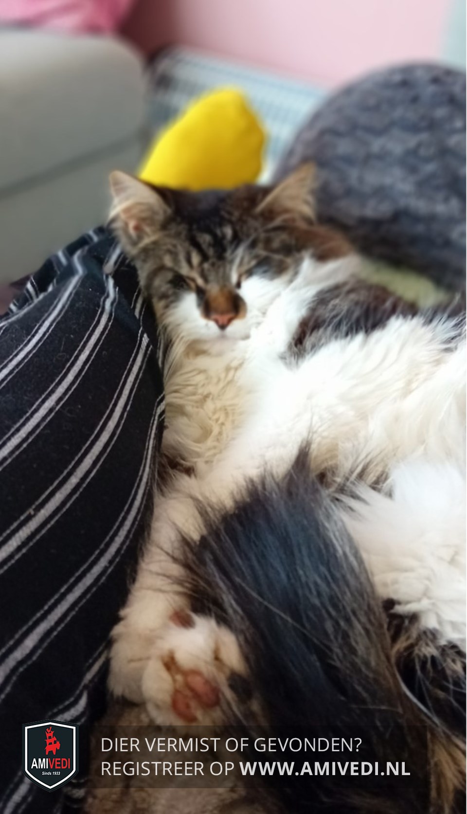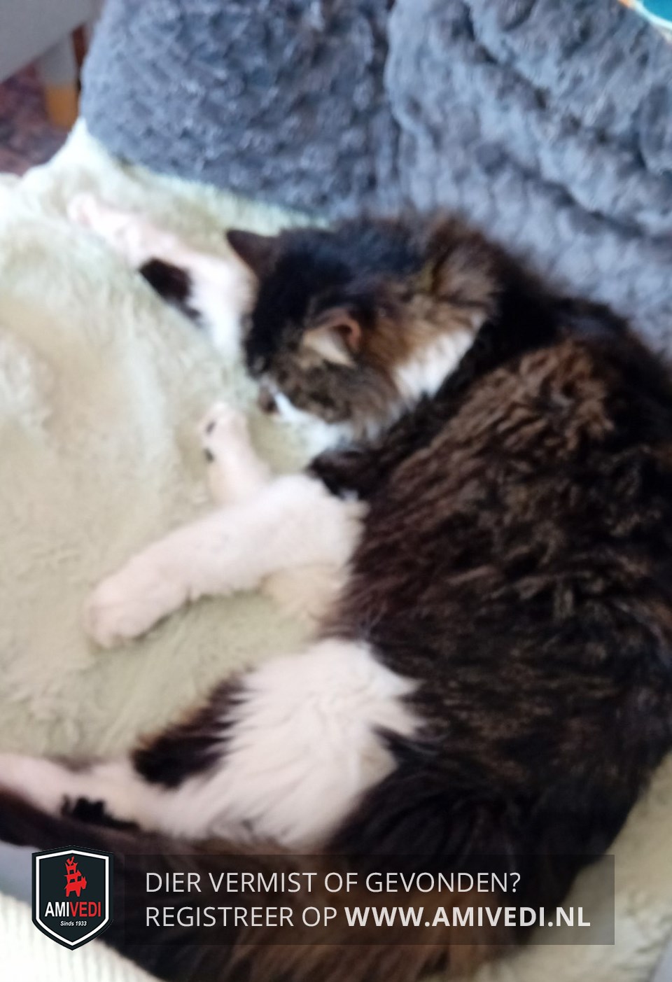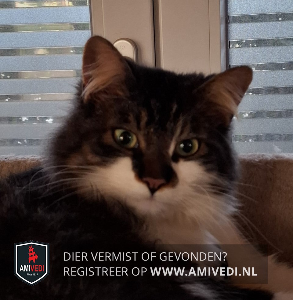 | Signalement | Langharig cypers zwart/bruin met wit. Zwart/bruin bovenop de kop, oren, zijkant kop en rondom de ogen. Zwart/bruine neusbrug en weerskanten van de neus klein beetje zwart/bruin. Langs binnenkant linkeroog een smal wit streepje. Witte wangen, rondom bek, kin, bef, borst en buik. Zwart/bruine rug, zijflanken en pluimstaart. Witte voorpoten, achterzijde rechter voorpoot een zwart/bruine vlek. Achterpoten wit, linker achterpoot heeft aan voorzijde en achterzijde bij de hak zwart/bruine vlekken. |