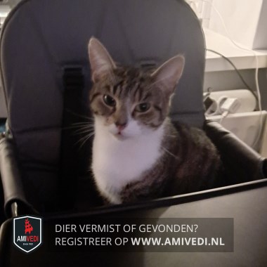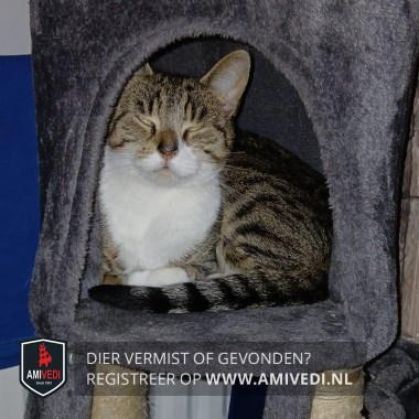 | Signalement | Europese korthaar poes, grijs/bruin met zwart gestreept en wit. Kopje grijs/bruin met zwart gestreept en witte snor en witte kin, smal streepje naast de neus aan linkerkant. Bruin en zwart op het neusje, brede volle bef. Linker voorpootje met witte sok. Staart zwart met grijze en bruine ringen. |