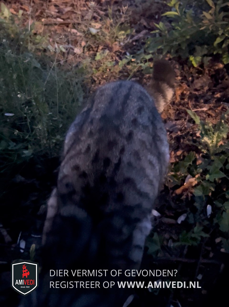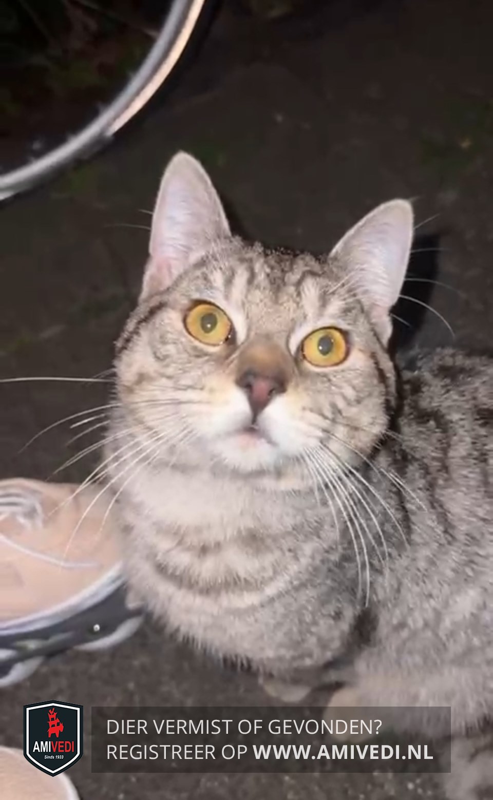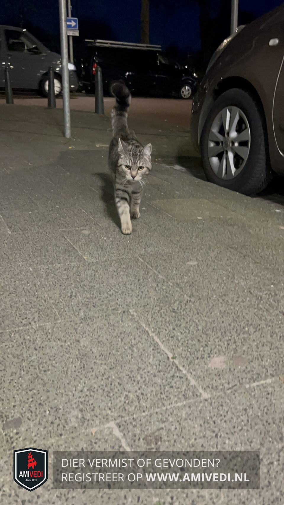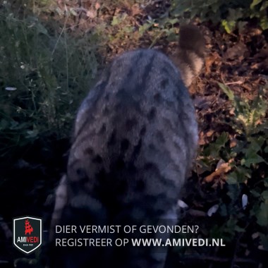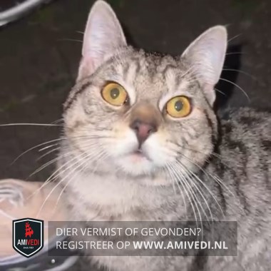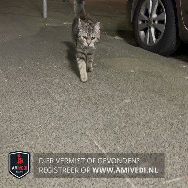 | Signalement | Zilvergrijze mackerel tabby kater met zwarte strepen over de rug. Lichtere vacht op borst en voorpoten. Gele/groene ogen. Zwarte (dikke) staartpunt.Korte, zachte vacht. Lijkt verzorgd. |