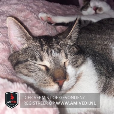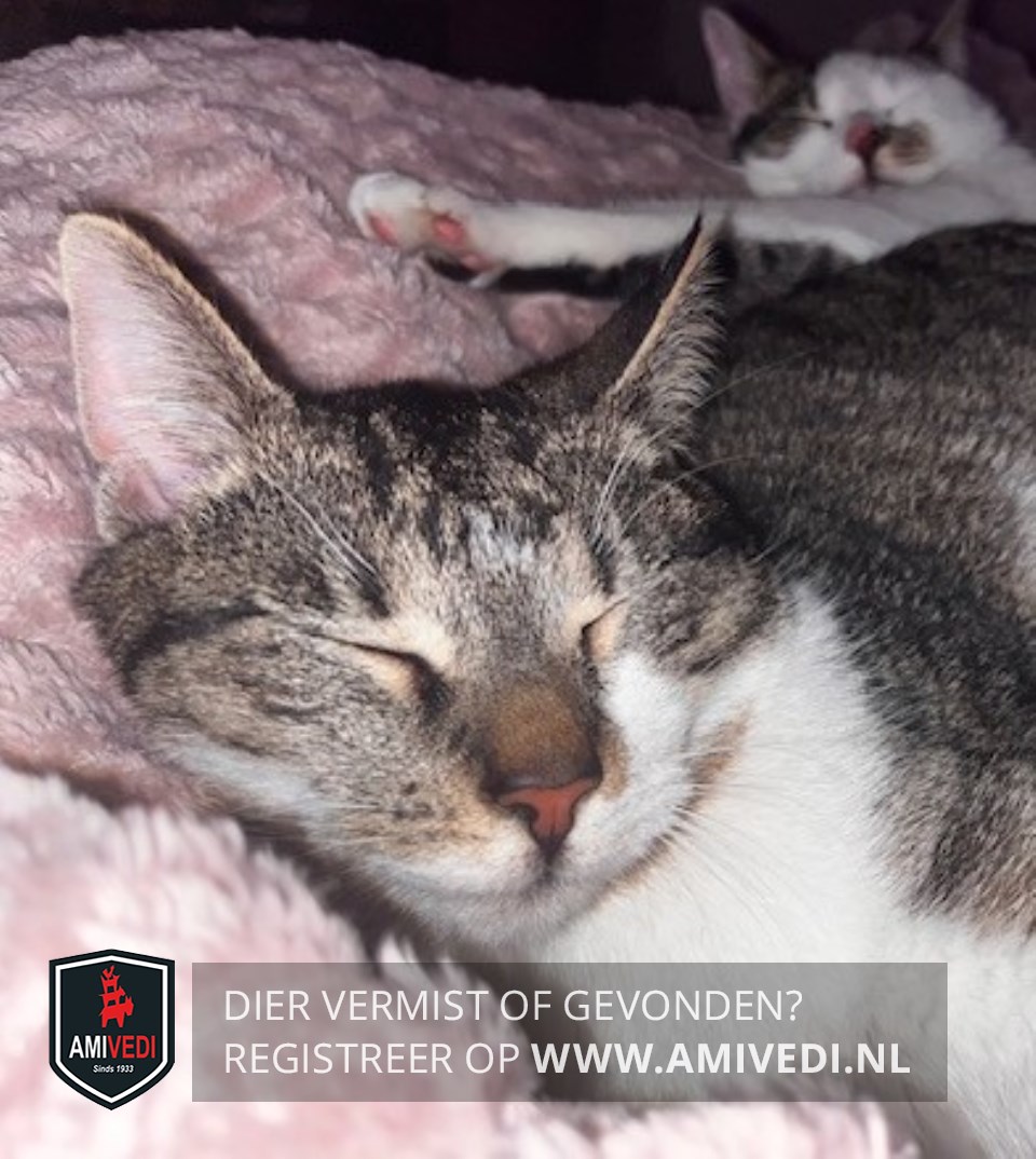 | Signalement | Cypers bruin/zwart met wit. Cypers bruin/zwart bovenop de kop, oren, zijkant kop, neusbrug, rondom ogen en tot en met de neus. Onder linkeroog begint het wit dat doorloopt onder de neus. Witte kin, bef, borst en buik. Grijs vlekje op de nek onder de bek. Cypers bruin/zwarte rug, zijflanken en staart. Linker voorpoot wit, aan voorzijde/binnenzijde bruin/zwarte vlek. Rechter voorpoot cypers bruin/zwart met witte sok. Beide achterpoten bruin/zwarte laarzen met witte voetjes. |
