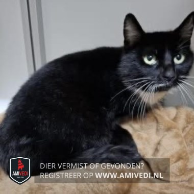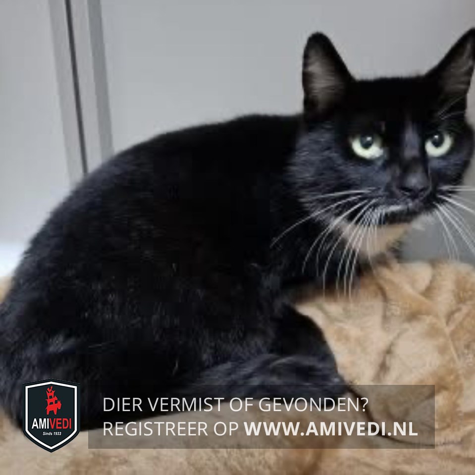 | Signalement | Geheel zwarte poes met rechts een wit veegje naast de neus en een witte bef. |