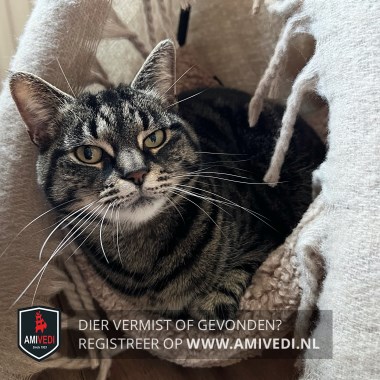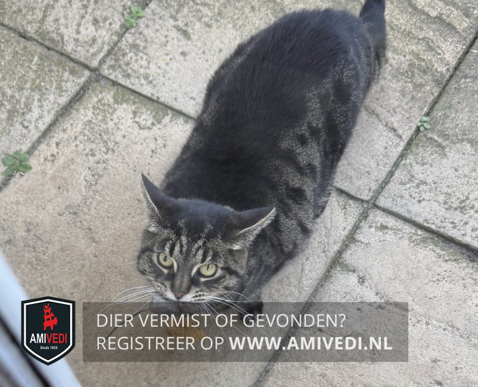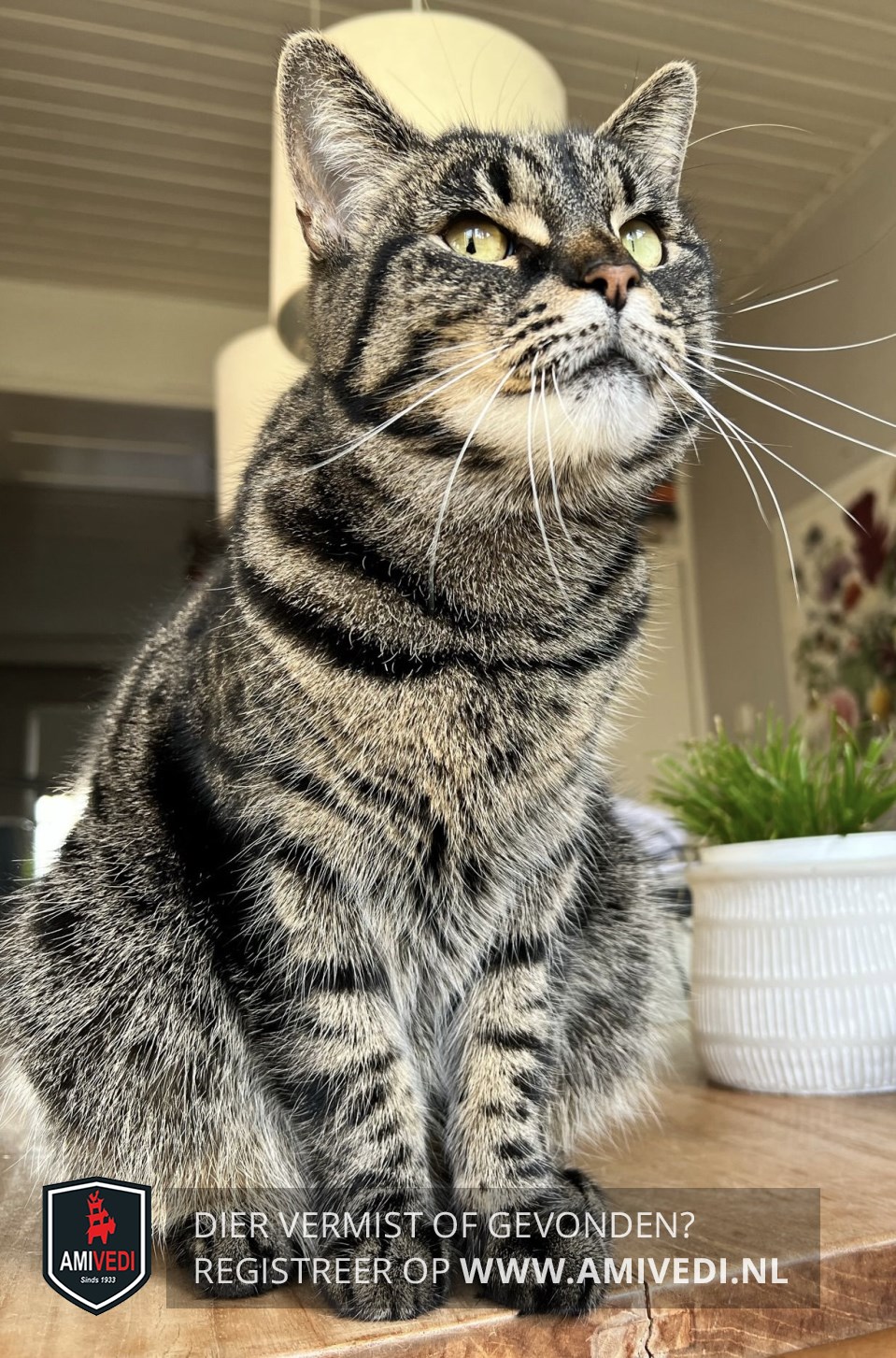 | Signalement | Volledig cypers bruin/zwart/beige. Lichte kin. Een brede zwart baan over de rug naar staart. Witte snorharen. Bovenop haar rechter oortje zit wat los vel, wat voelt als een bolletje. |