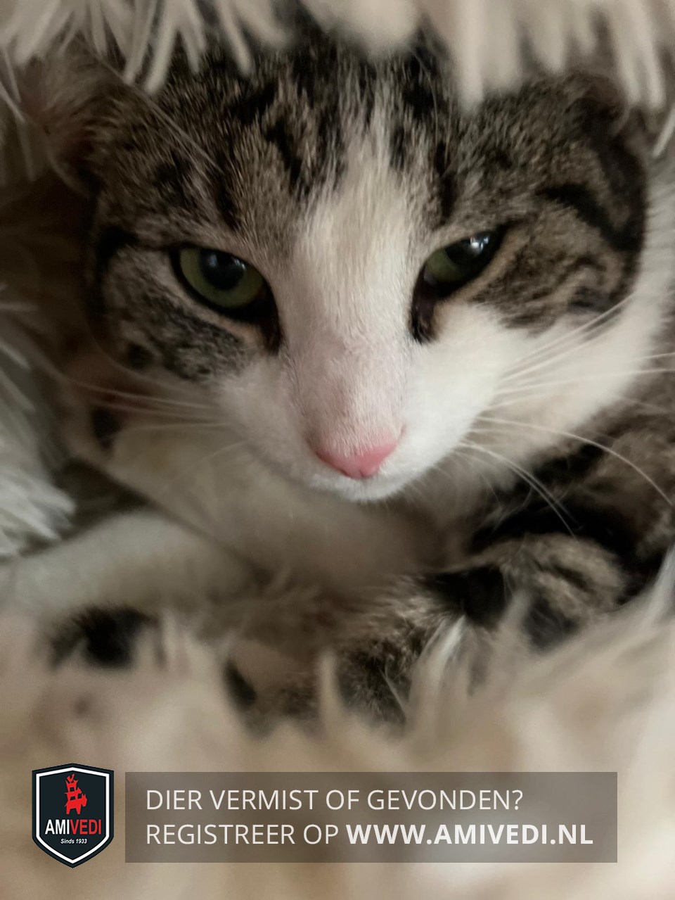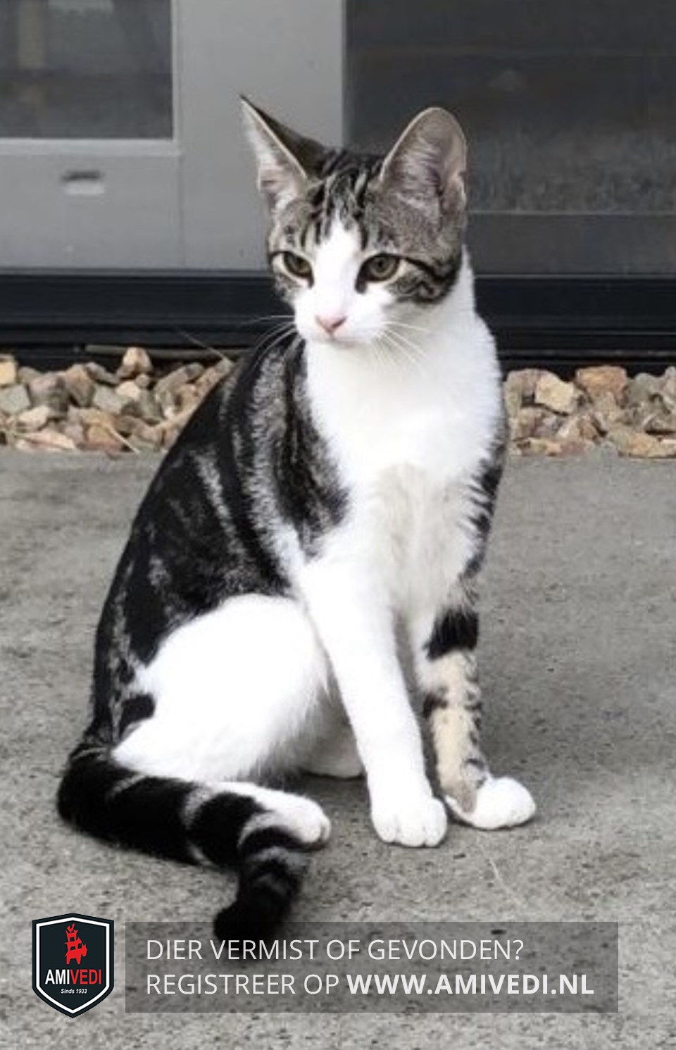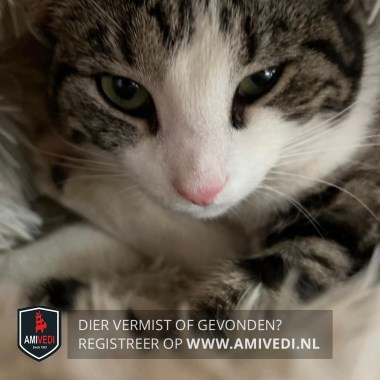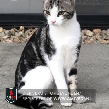 | Signalement | Europese korthaar poes, grijs met zwart gemarmerd en wit. Kopje grijs met zwart gestreept en witte bles, witte snuit, witte kin. Witte kraag, witte bef, witte borst, witte buik. Linker voorpoot grijs met zwart en wit voetje, rechter voorpoot volledig wit. Achterpoten en heupen wit. Rest van de vacht grijs met zwart gemarmerd, staart zwart met enkele grijze halve ringen. |