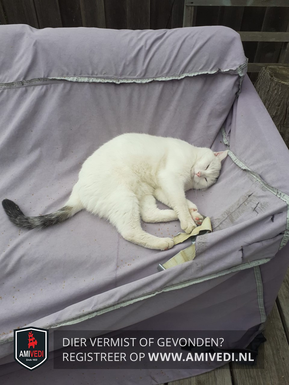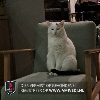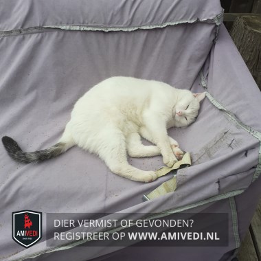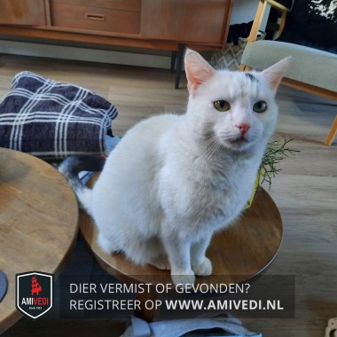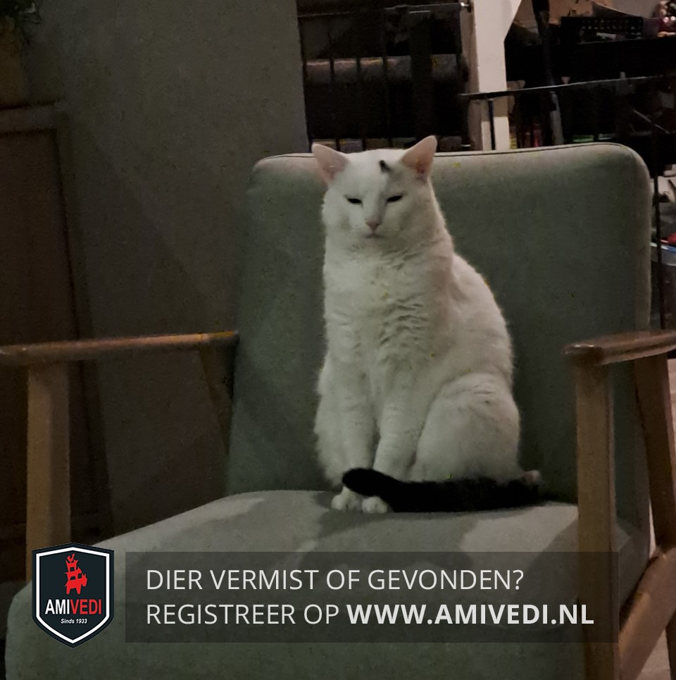 | Signalement | Witte kat met een zwarte staart en een zwart vlekje boven zijn linkeroog. Groene ogen. Doordat hij veel buiten is, kan hij wat grijs zijn door het stof in zijn vacht. |