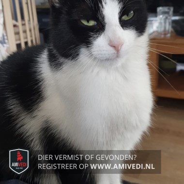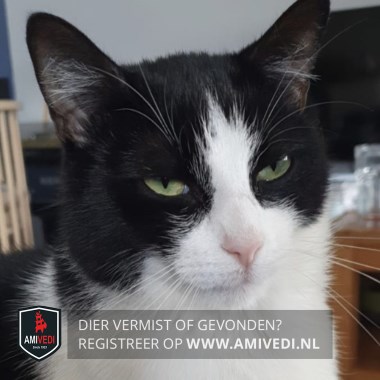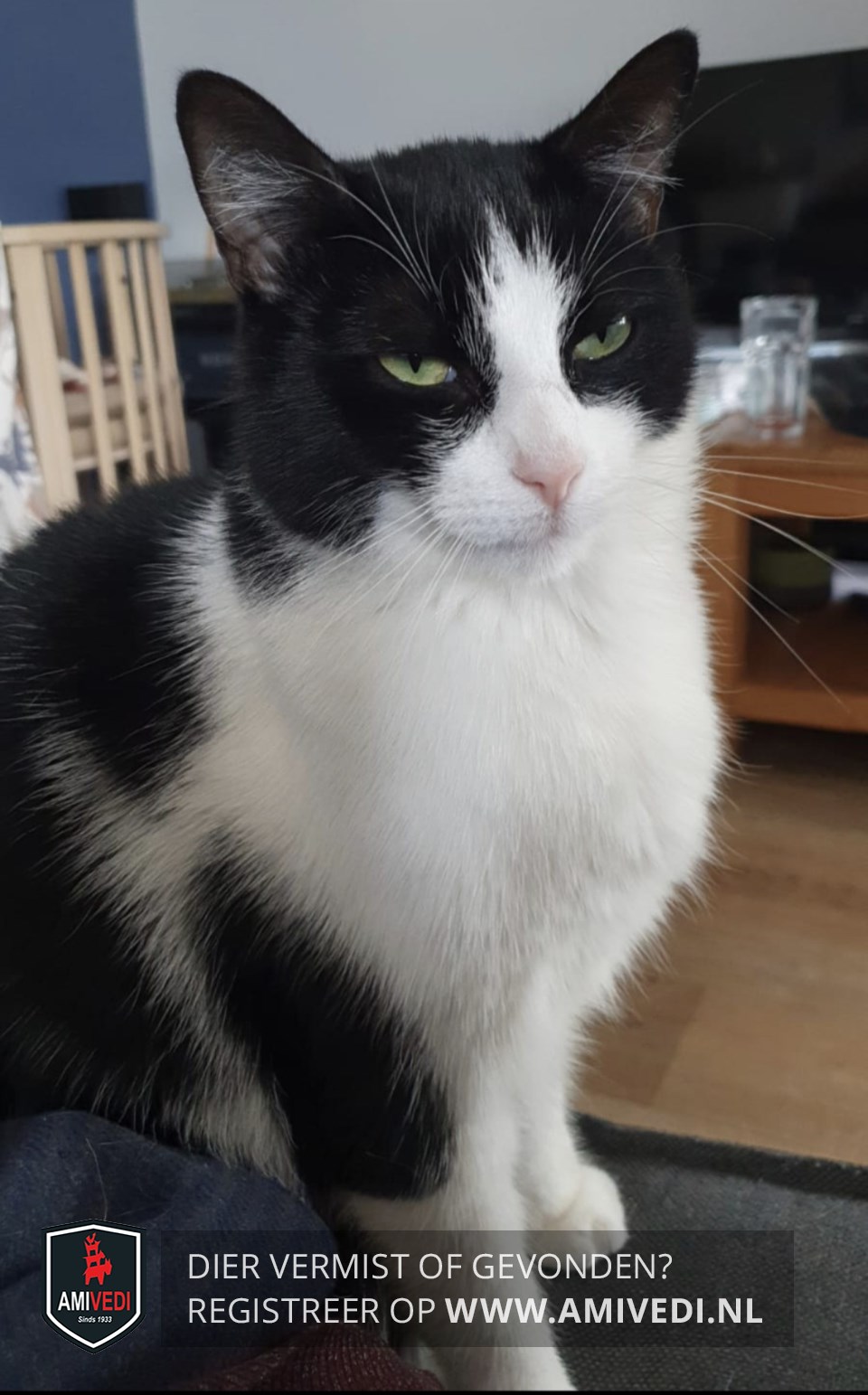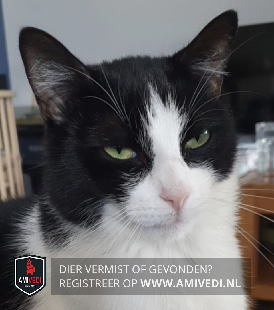 | Signalement | Zwart-witte kater. Witte snuit, hals, borst en buik. Zwart over ogen en oren. Zwart vlak bovenaan rechter voorpoot. Zwarte vlakken op rug en flanken. Roze neuspunt en groene ogen. Heeft blaasgruis, dus krijgt dieet voer. |