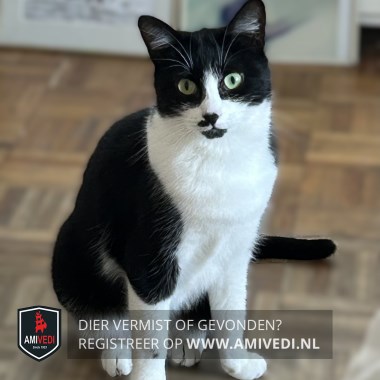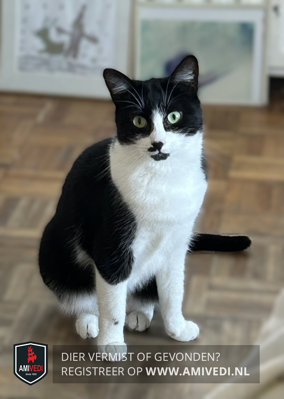 | Signalement | Zwart-witte poes. Kopje bovenop zwart tot onder de ogen, rug en flanken zijn grotendeels zwart, de staart is ook zwart. Rond het zwarte neusje een klein zwart plukje op de rechterwang en een zwarte onderlip in een verder wit kinnetje en bef en buik. De poten zijn voornamelijk wit met bovenaan de overgang naar zwart. |