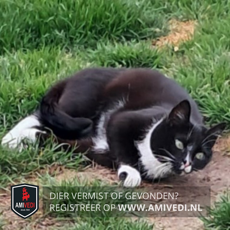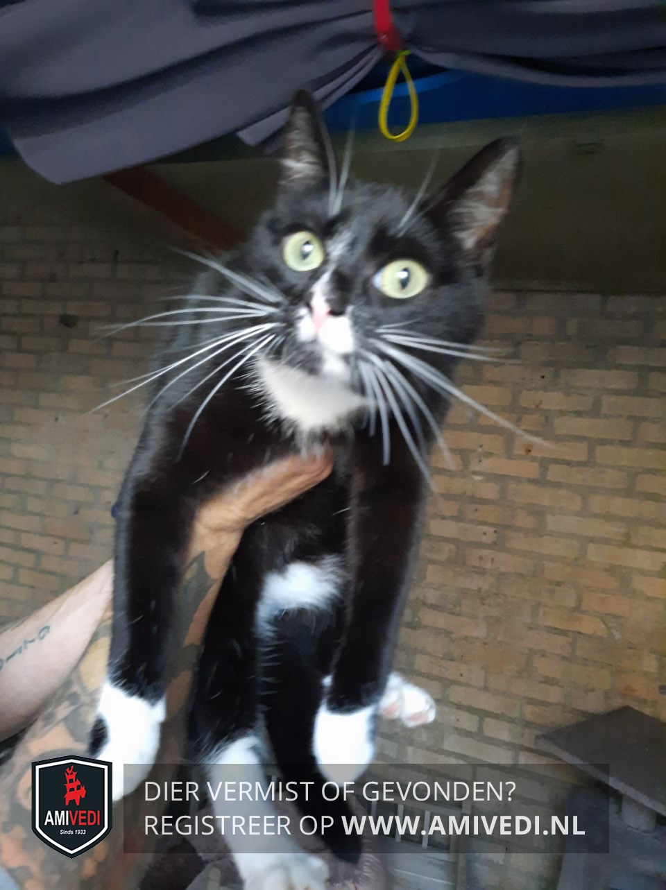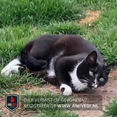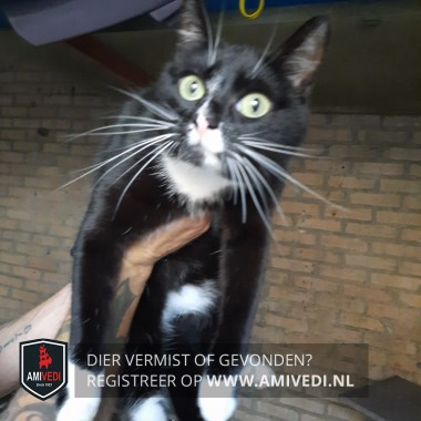 | Signalement | Zwart met wit streepje op neus, wit op de bovenlip en links op de kin, witte bef, en wit op de onderbuik, witte kniekous rechts achter en 3 witte voetjes, rechter voorvoetje zwarte vlek. |