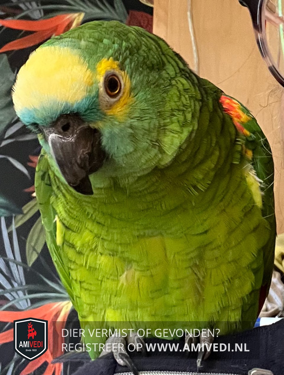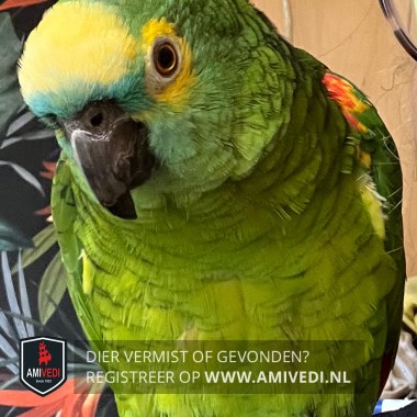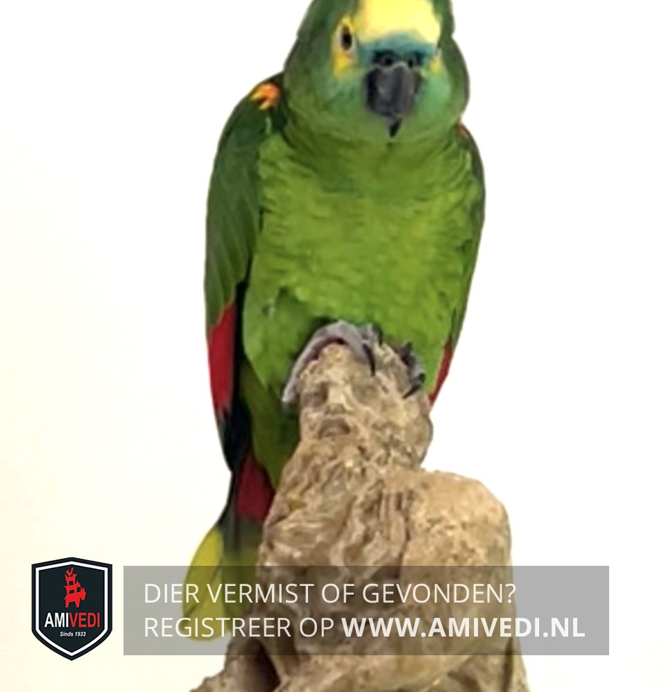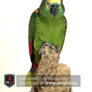 | Signalement | Fel groene met geel en rode Blauwvoorhoofd Amazonepapagaai, bovenop de kop geel, zwarte snavel, overwegend groen met rode vlammetjes aan de vleugels, ook iets rood op de vleugelstreaap |