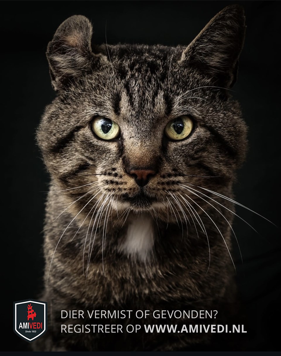 | Signalement | Cypers grijs-zwart met wit plekje op bef. Zijn ene oor is kleiner dan het andere oor. |