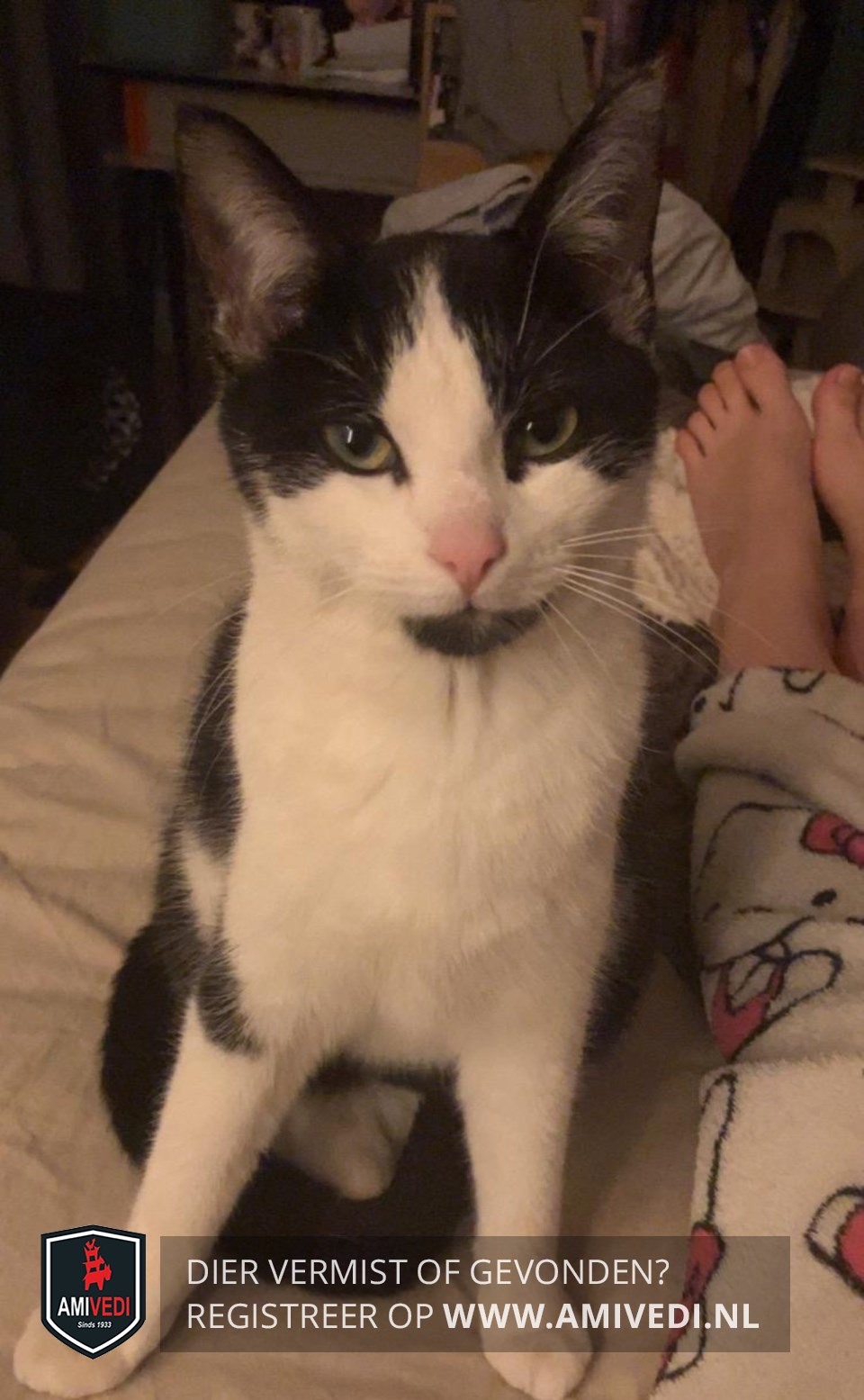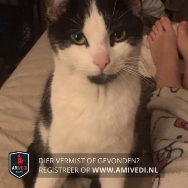 | Signalement | Zwart bovenop de kop, oren, half over de ogen naar zijkant kop. Vanaf voorhoofd in een punt wit dat breder uitloopt over de neusbrug, wangen en rondom de neus. Zwarte kin. Witte bef, borst en buik. Beide voorpoten wit, bij linker voorpoot aan de bovenkant en buitenzijde een zwarte vlek. Zwarte rug en staart. |