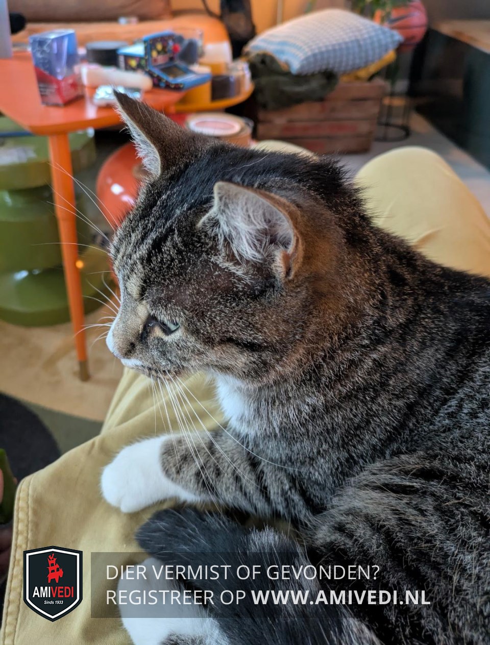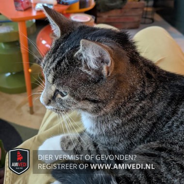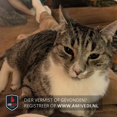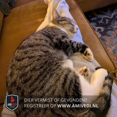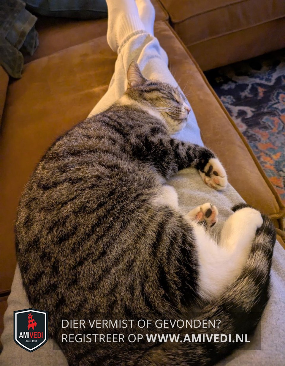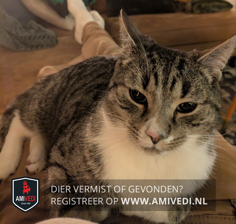 | Signalement | Cypers grijs/zwart met wit. Cypers grijs/zwart bovenop de kop, oren, zijkant kop, rondom de ogen en neusbrug. Boven de neus klein beetje wit wat verder doorloopt naar rechterkant langs en onder de neus. Grijze snorhaarkussentjes. Onder onderlip grijs vlekje, witte kin, bef en borst. Cypers grijs/zwarte rug, zijflanken en staart. Voorpoten cypers grijs/zwart met witte sokjes. Achterpoten cypers grijs/zwart met witte laarzen, met kenmerkend een zwarte vlek op rechter achterpootje. |