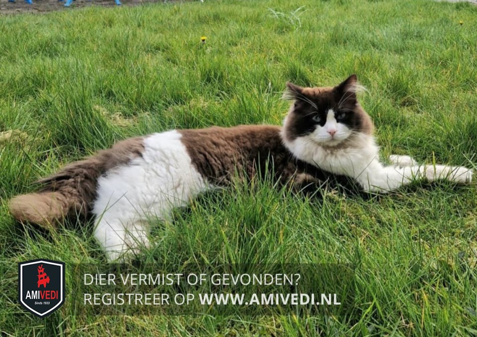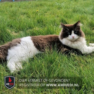 | Signalement | Bruin met wit ( bicolor ragdoll) Witte snuit, hals, bef, borst, buik, pootjes. |