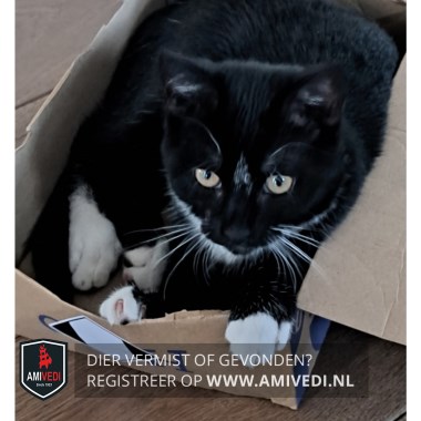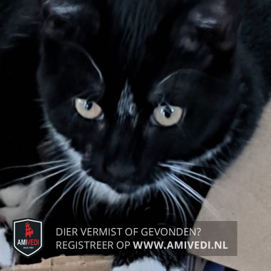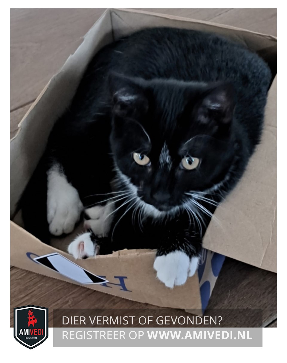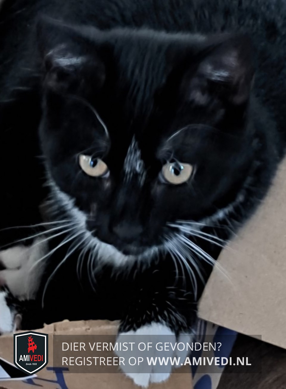 | Signalement | Zwart met wit. Witte bef, witte voetjes, witte snorharen, witte haartjes tussen de gele ogen |