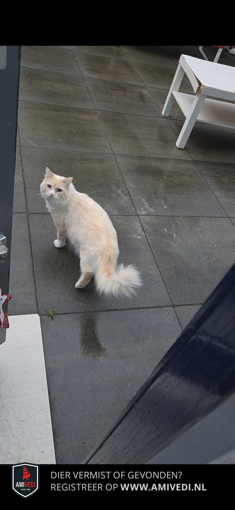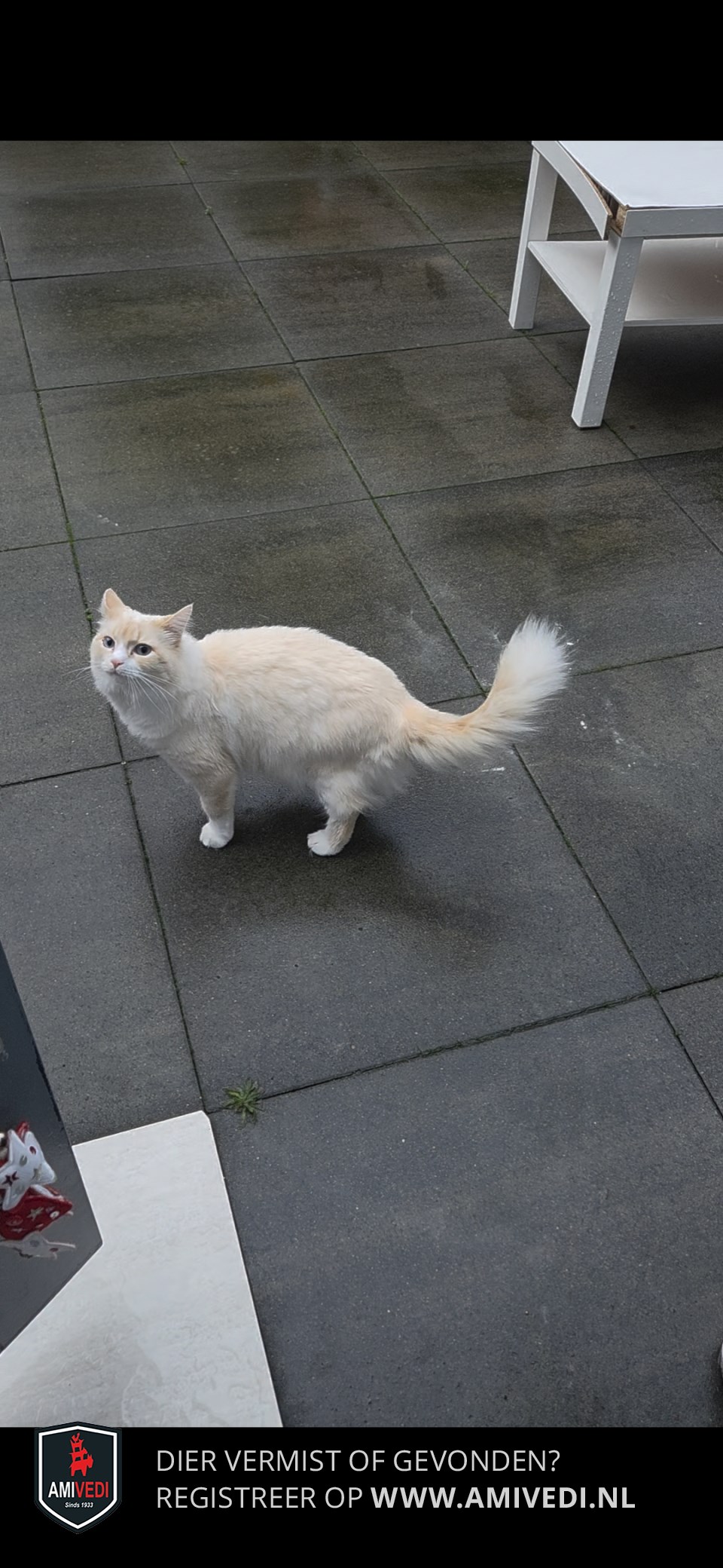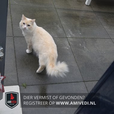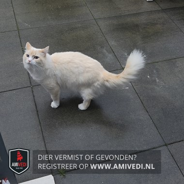 | Signalement | Hij heeft blauwe ogen, wit, beige kleur vacht (kan ook lichtbruin zijn in bepaald licht). Volle staart. |