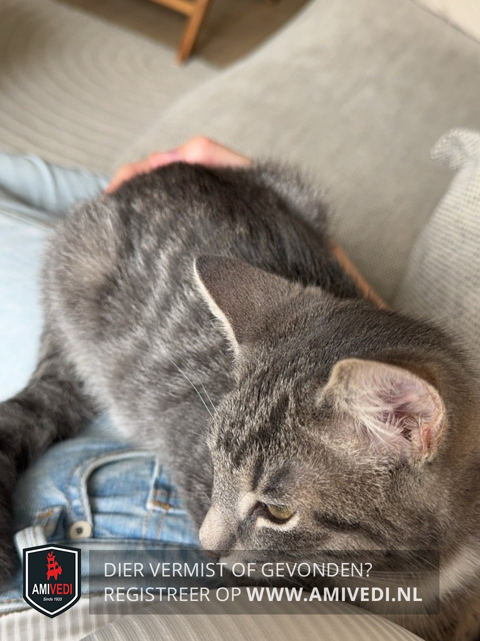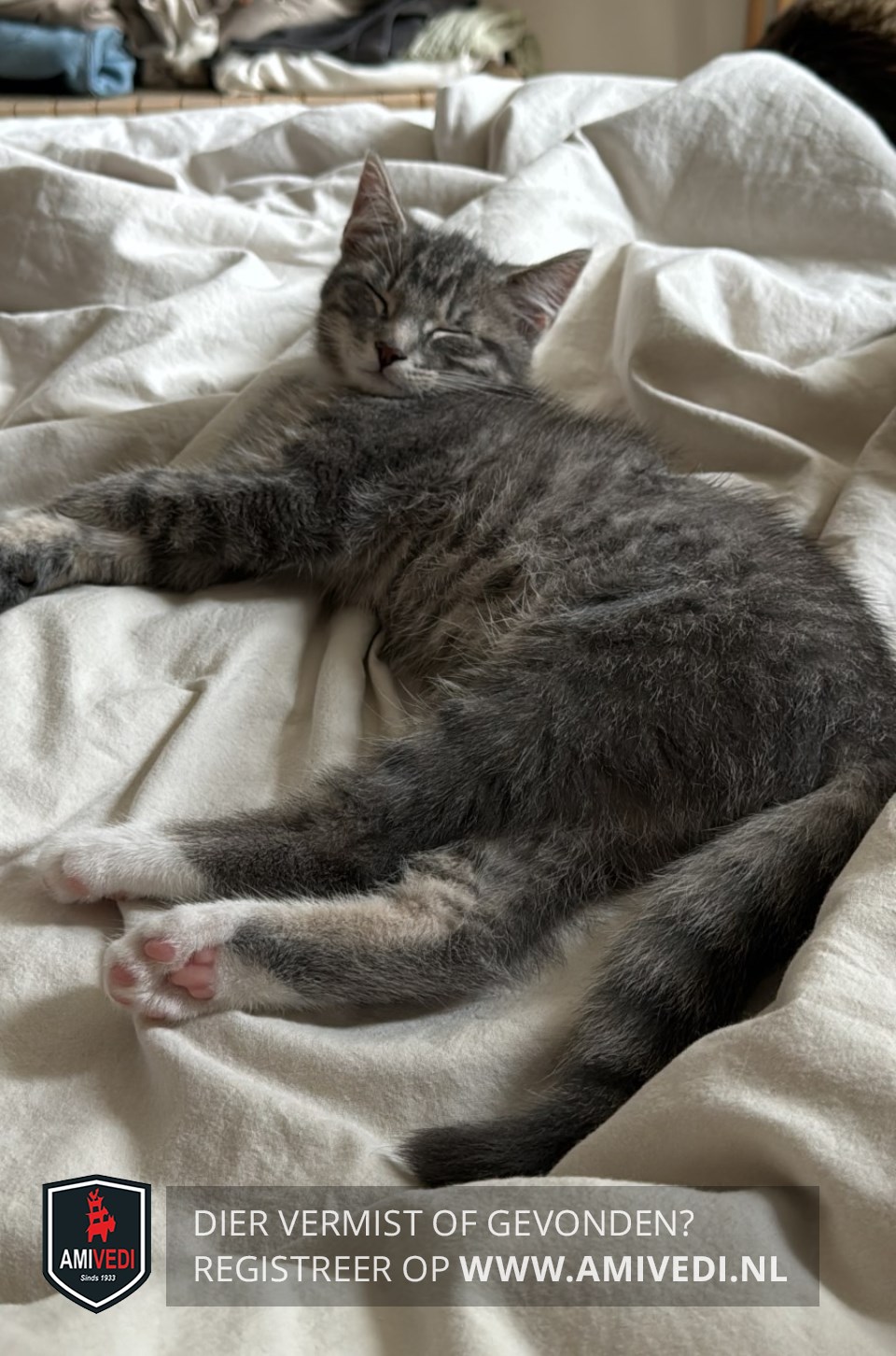 | Signalement | Cypers grijs gestreept met wit, gele ogen,wit op kin, witte bef, witte voetjes achterpoten, gestreepte staart. |