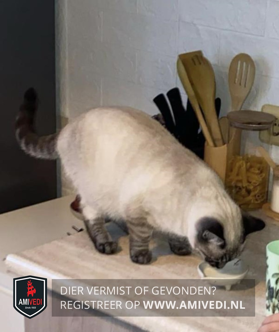 | Signalement | Wit met grijs en zwart. Fel blauwe ogen. Grijze snoet. Zwarte oren. Grijs gestreepte pootjes met zwarte voetjes. De staart is grijs/zwart geringd. Lijfje is wit met een beige gloed. |