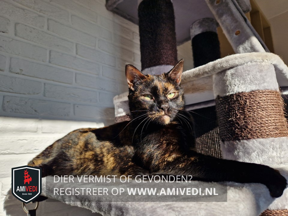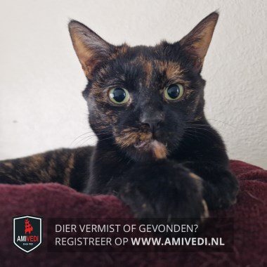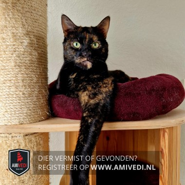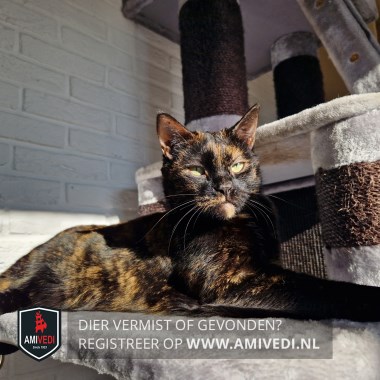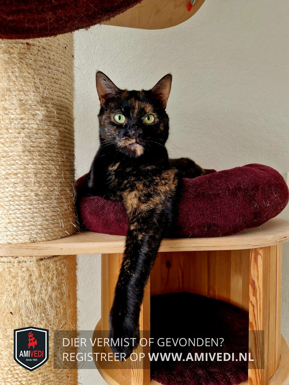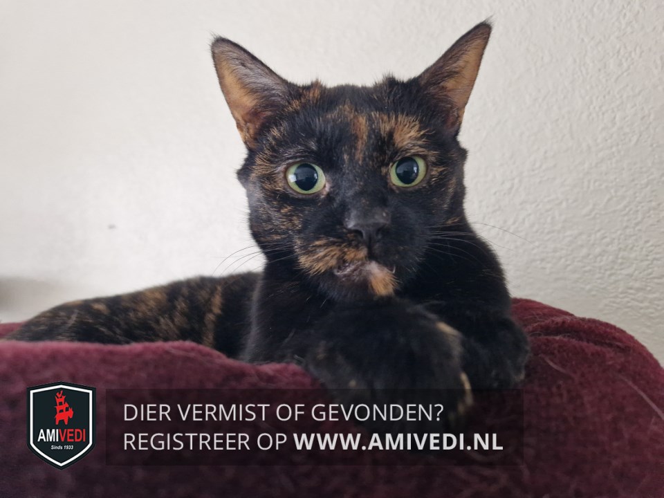| Signalement | Donkere Schildpad met licht vlekje op de kin, groene ogen. Door neurologische afwijking is ze snel gestresst en draait alle kanten op. Erg angstig, niet buiten gewend. |