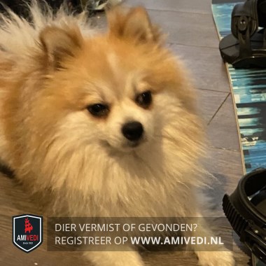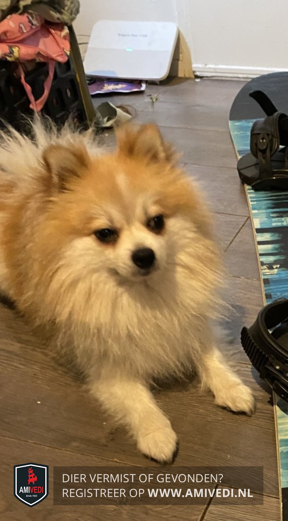 | Signalement | Pommeriaan hondje. Beige/blond bovenop de kop, oren, voorhoofd tot boven de ogen, rug en zijflanken. Witte neusbrug, onder de ogen, kin, bef en borst. Beide voorpoten wit. Hij is fit en klein. |