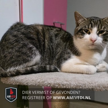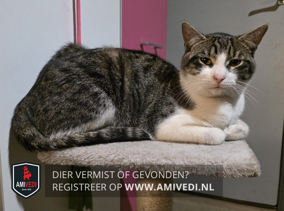 | Signalement | Europese korthaar kater, grijs/bruin met zwart gestreept en wit. Witte bles, witte snuit, witte kraag, witte bef en witte borst. Voorpootjes volledig wit, Langs de rechter heup witte streep. |