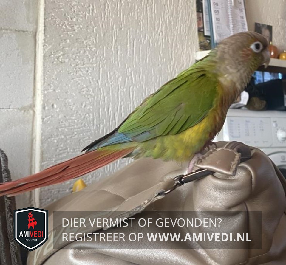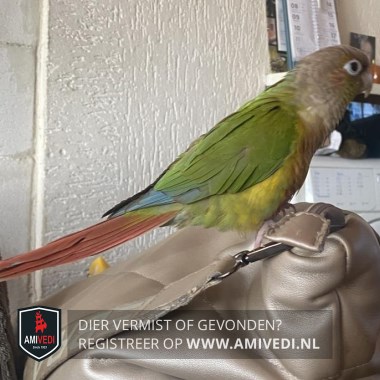 | Signalement | Pyrrhura, groen, rood, grijs, blauw. Grijze kop met hint van rood erdoor, rood/oranje borst, groen/gelig buikje, groene vleugels met blauwe uiteinde, groene rug, rode staartveren. |