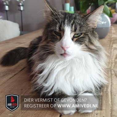 | Signalement | Noorse boskat, cypers bruin-zwart gestreept met wit. Witte snuit, bef en voetjes. |