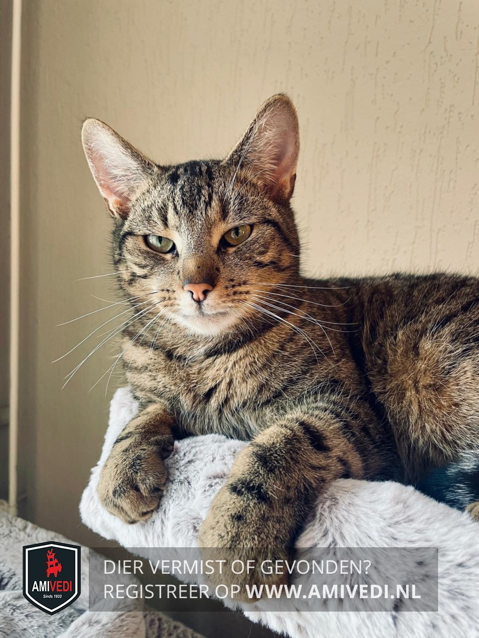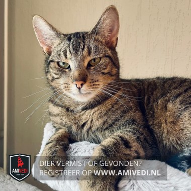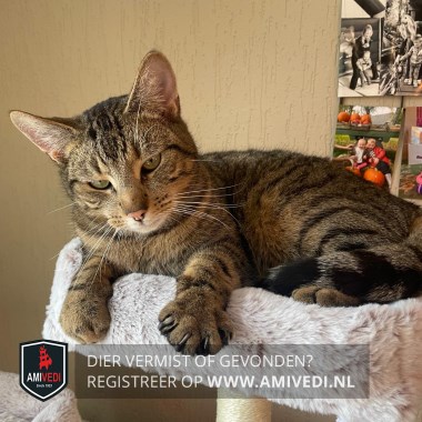 | Signalement | Cypers bruin zwart met wit rond de mond. |