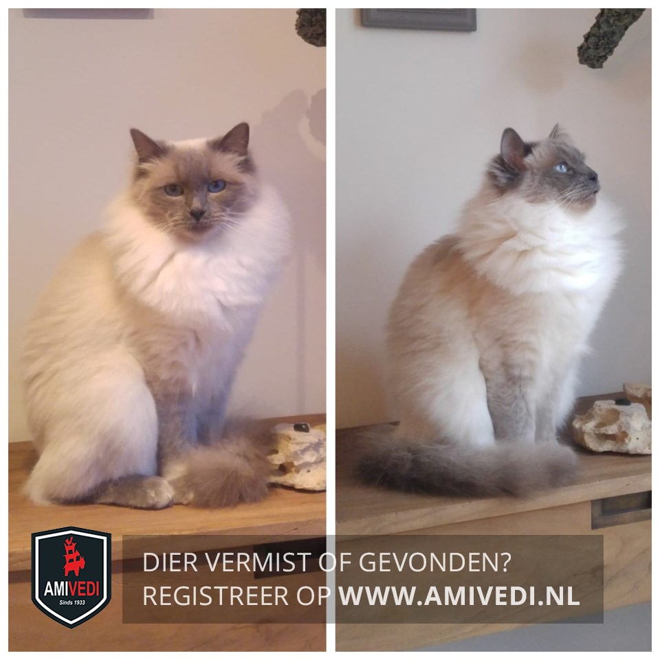| Signalement | Een witte Ragdoll met blue point patroon als vacht. Grijs gezicht, grijze pluimstaart en grijze poten. Bijzonder is dat 1 teen witte vacht heeft en de rest grijs. Het kussentje van zijn poot heeft daar ook een andere kleur dan de andere kussentjes. |