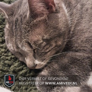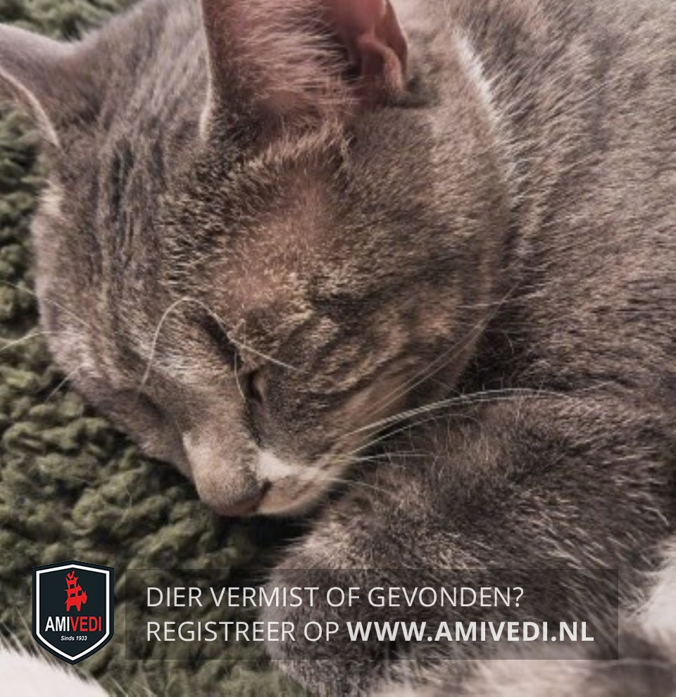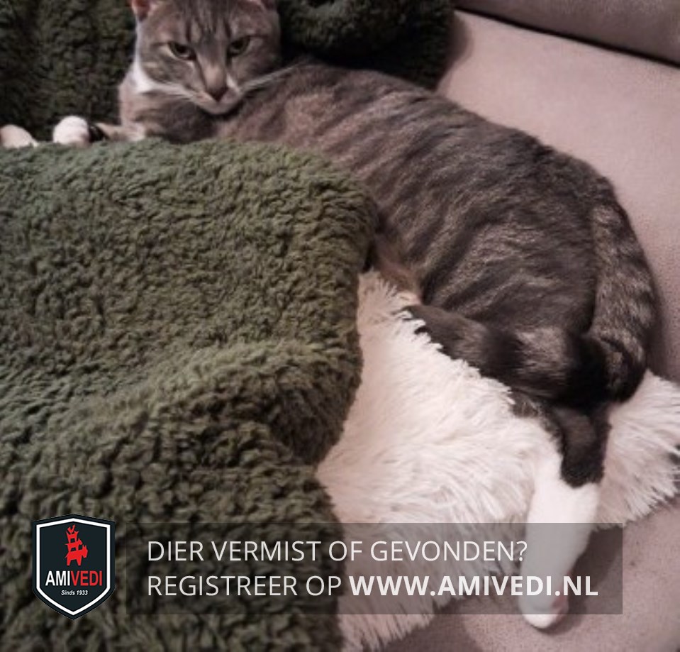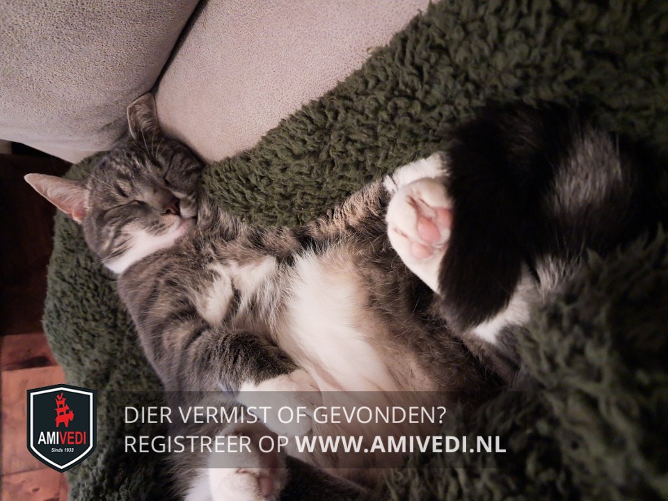 | Signalement | Cypers grijs met wit. Beetje wit links naast de neus, witte kin en bef. Witte buik. Voorpootjes hebben witte voetjes, linker achterpoot heeft een witte sok. De staart heeft een donkere punt. |